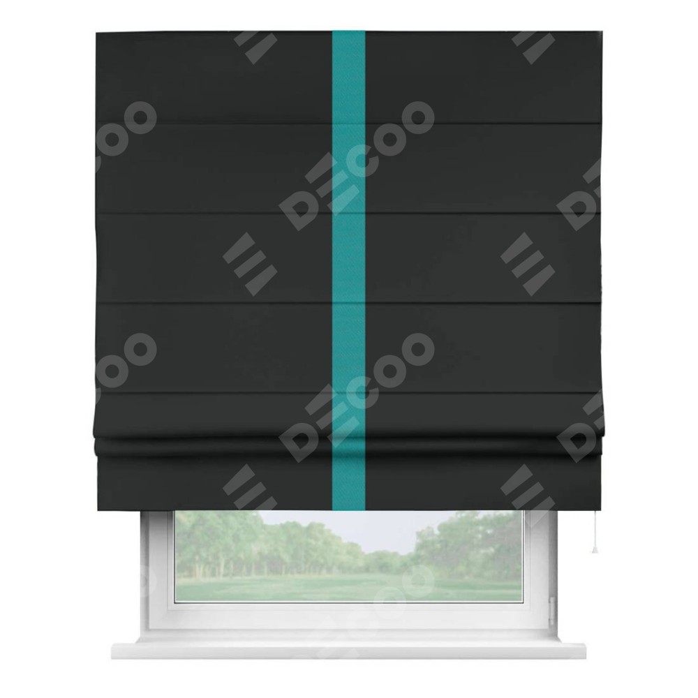 Римская штора производителя «Cortin», используется для проёма, пошита из ткани блэкаут однотонный черный, артикул ткани 91571−2. Отделка шторы кантом «Хайвей», ткань для канта используется из блэкаута однотонного разной расцветки на выбор. Имеет универсальный механизм и подходит для монтажа: на потолок, на стену и в нишу.