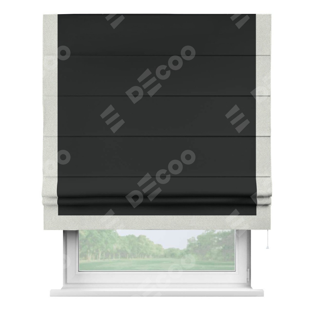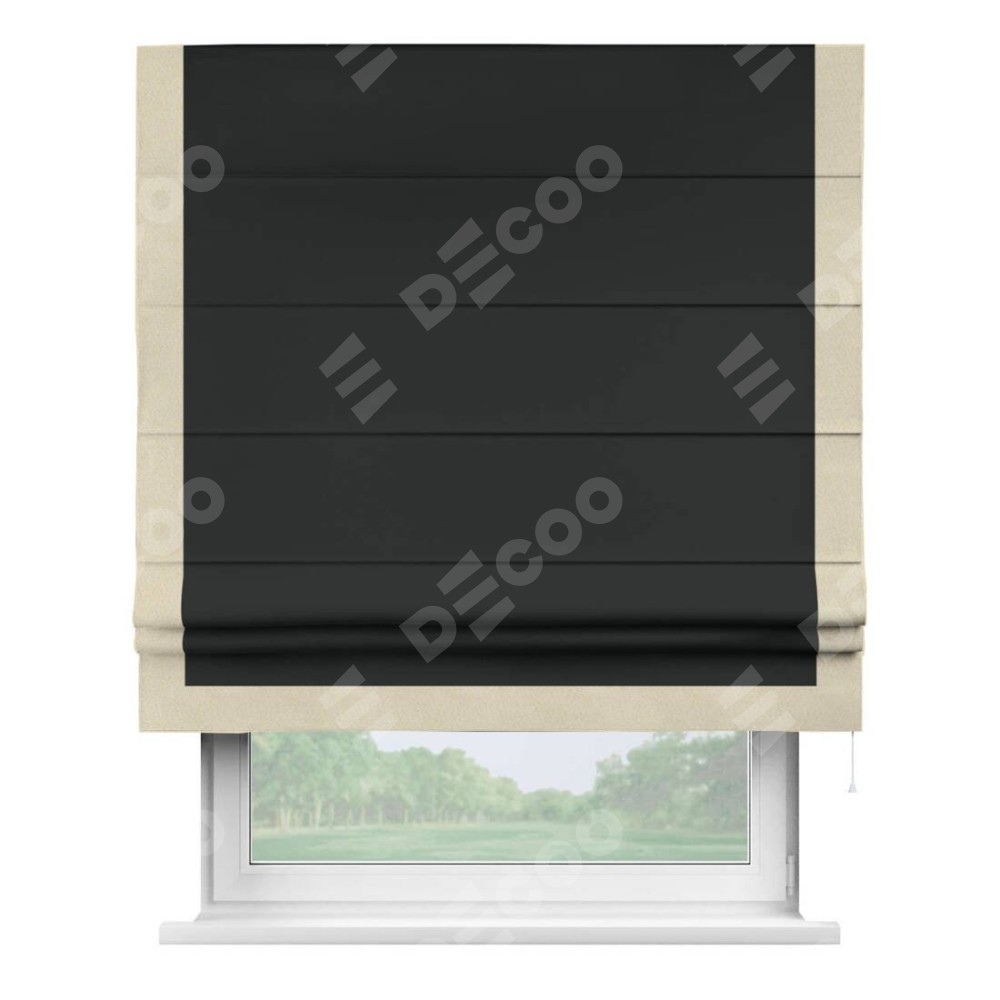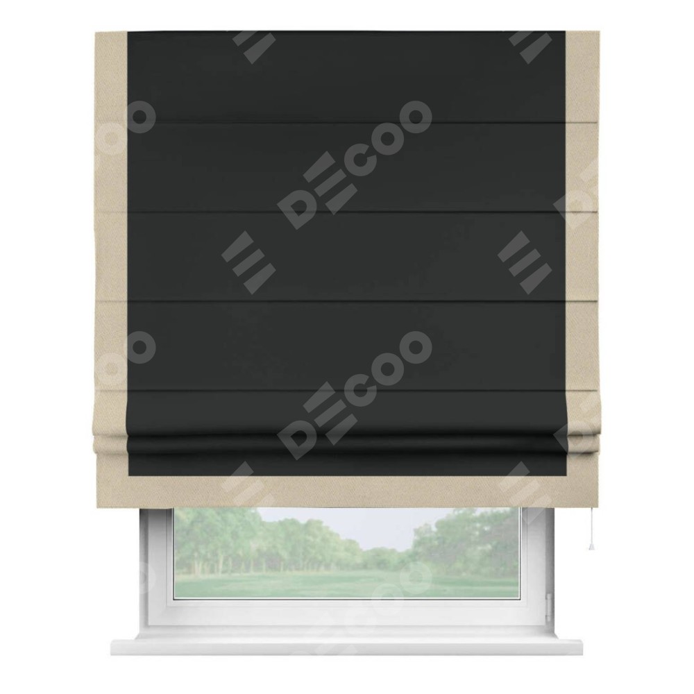 Римская штора производителя «Cortin», используется для проёма, пошита из ткани блэкаут однотонный черный, артикул ткани 91571−2. Отделка шторы кантом «Виктория», ткань для канта используется из блэкаута однотонного разной расцветки на выбор. Имеет универсальный механизм и подходит для монтажа: на потолок, на стену и в нишу.