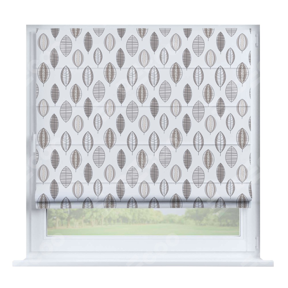 Римская штора производителя «Cortin», устанавливается на створку окна, пошита из ткани блэкаут с нанесением сублимационной печати «Кофейные листья». Штора шьётся по индивидуальным размерам, для данного типа римской шторы возможная ширина от 35 до 150 см., высота до 250 см.