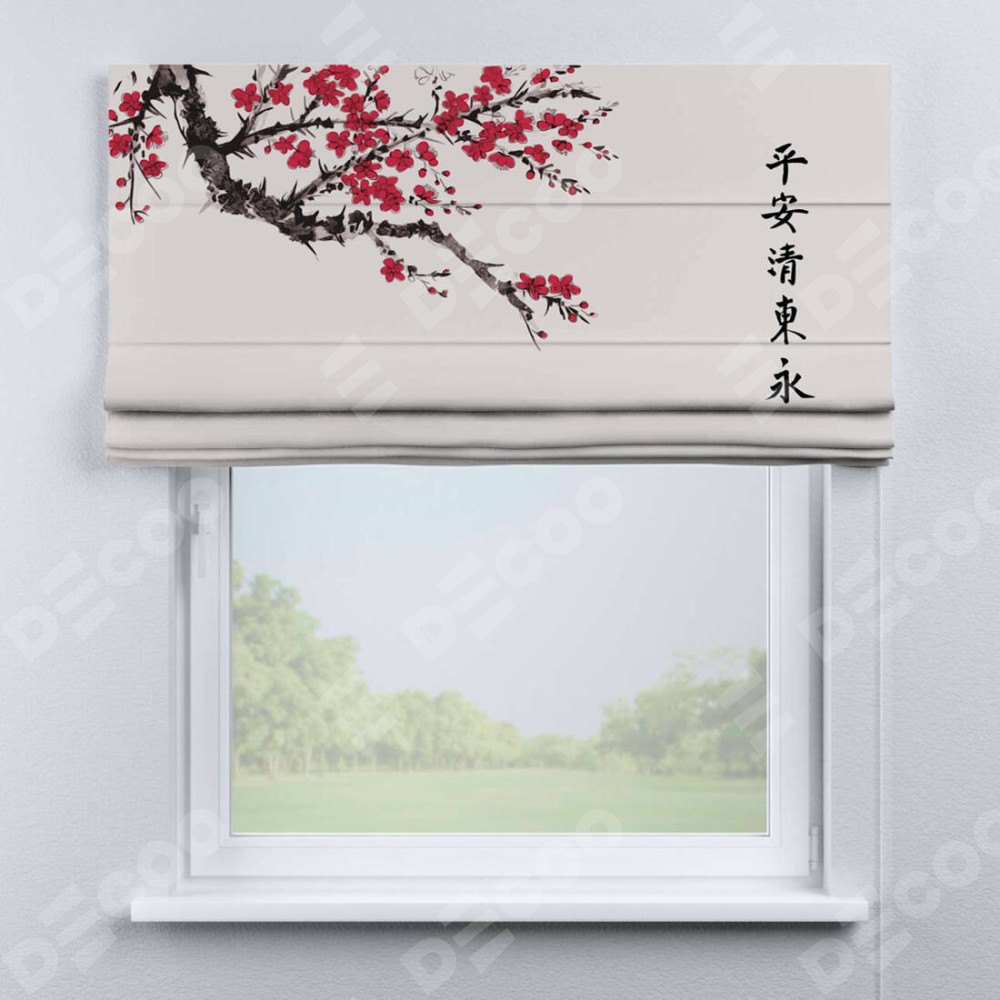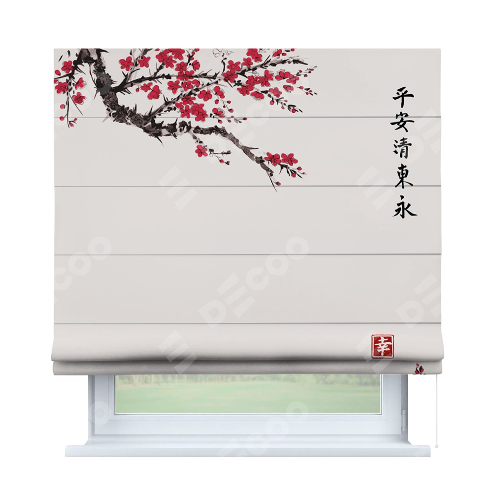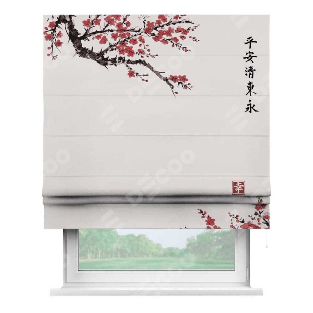 Классическая римская штора производителя «Cortin», пошита из ткани блэкаут с нанесением сублимационной печати «Цветущая сакура». Имеет универсальный механизм и подходит для монтажа: на потолок, на стену и в нишу.