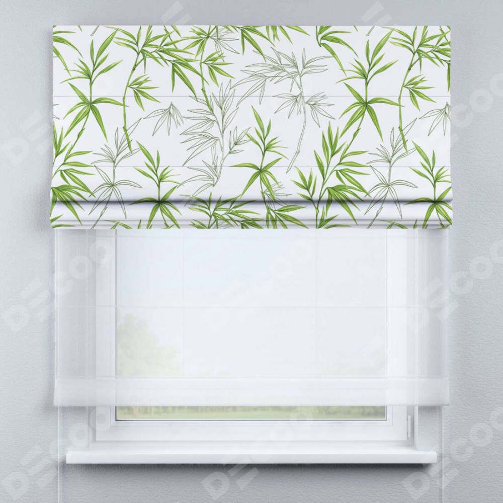 Двойная римская штора «День-ночь» от производителя Cortin предназначена для использования в проёмах. Эта штора уникальна тем, что состоит из двух полотен. На лицевой стороне находится блэкаут с нанесением сублимационной печати «Зелёный бамбук», обеспечивающий эффективное затемнение. В комплект также входит вторая ткань — легкий белый тюль (артикул: V-01), который добавляет изящества и легкости оформлению окна. Кроме того, доступны и другие разновидности ткани тюль, выбор которых доступен по  ссылке .