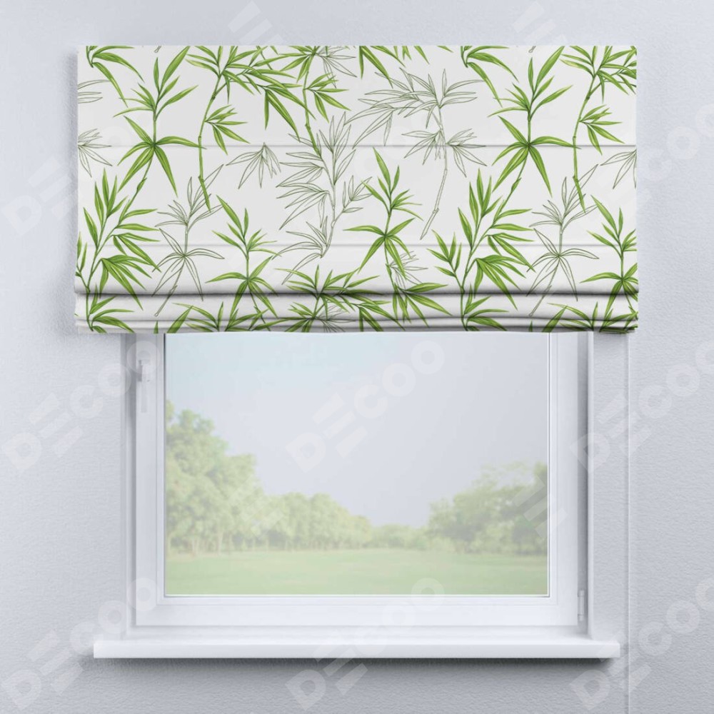 Классическая римская штора производителя «Cortin», пошита из ткани блэкаут с нанесением сублимационной печати «Зелёный бамбук». Имеет универсальный механизм и подходит для монтажа: на потолок, на стену и в нишу.