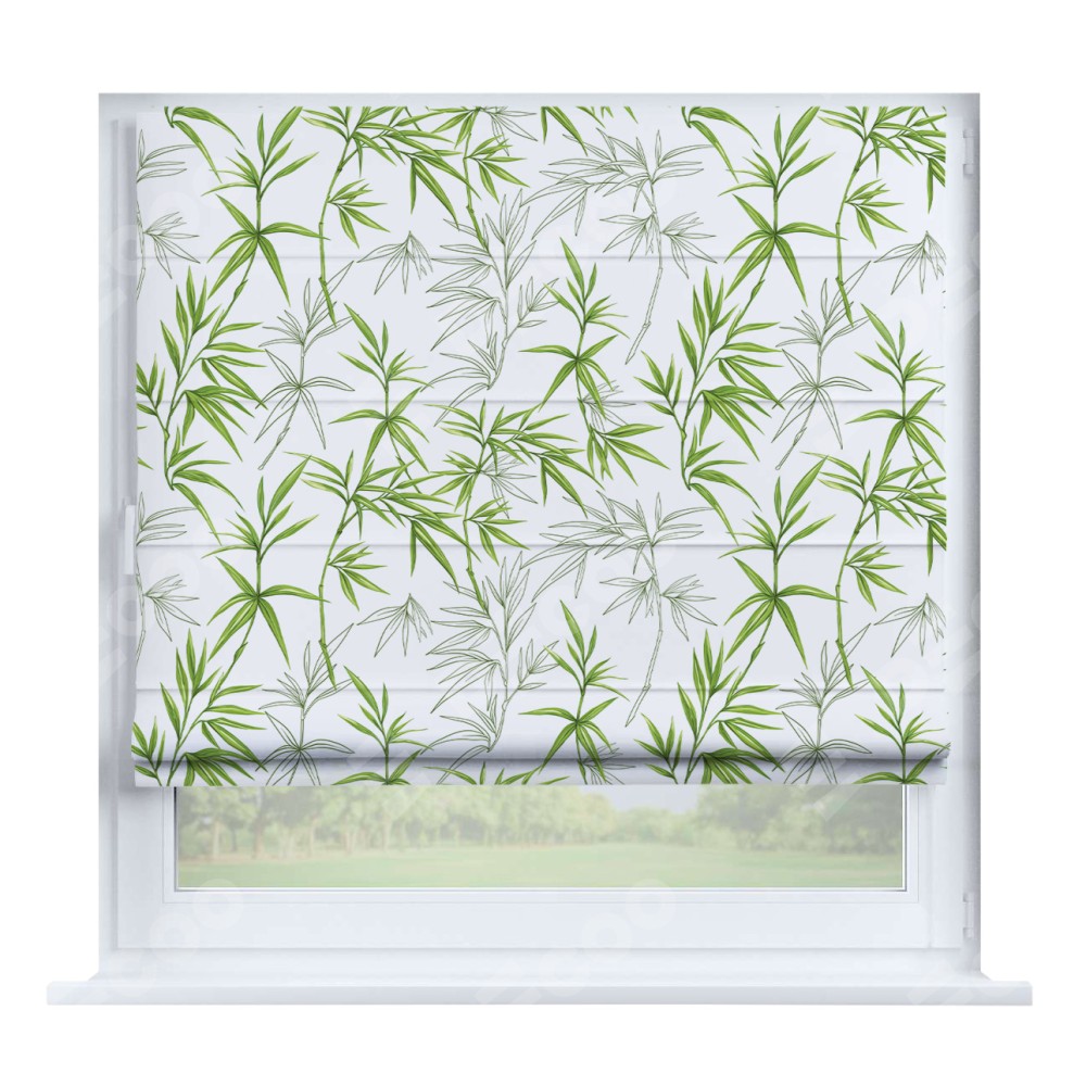 Римская штора производителя «Cortin», устанавливается на створку окна, пошита из ткани блэкаут с нанесением сублимационной печати «Зелёный бамбук». Штора шьётся по индивидуальным размерам, для данного типа римской шторы возможная ширина от 35 до 150 см., высота до 250 см.