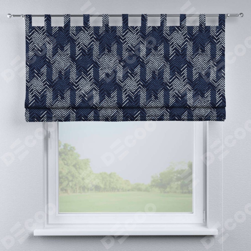 Римская штора производителя «Cortin», используется для проёма, пошита из ткани блэкаут с нанесением сублимационной печати «Пёстрый зигзаг». Данная модель пошита на петлях, комплектуется на выбор круглым карнизом и подходит для монтажа на стену. Римская штора на петлях имеет простую систему регулировки высоты, отличительным преимуществом данной модели является простой способ монтажа. Достаточно повесить ее на трубу и штора готова!