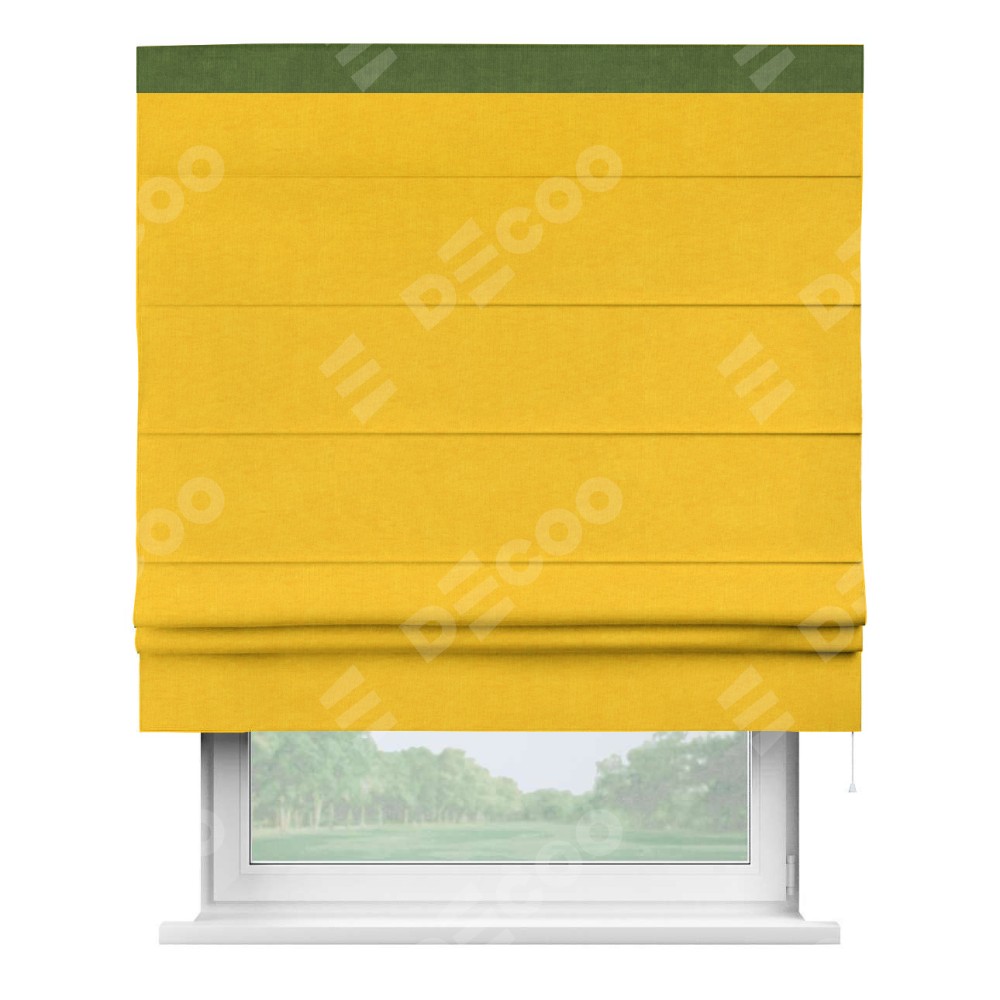 Римская штора производителя «Cortin», используется для проёма, пошита из ткани канвас желтый, артикул ткани v-344. Отделка шторы кантом «Кинг» (трава v-473), ткань для канта используется из канваса разной расцветки на выбор. Имеет универсальный механизм и подходит для монтажа: на потолок, на стену и в нишу.