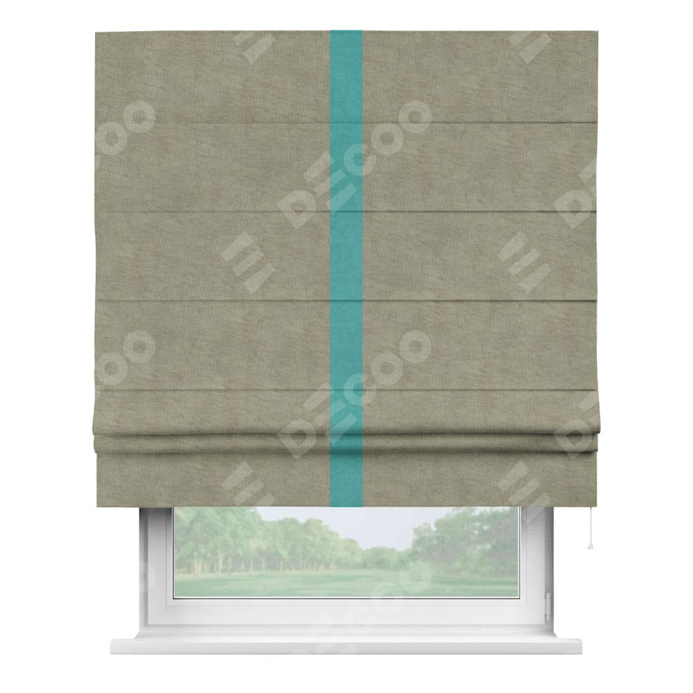 Римская штора производителя «Cortin», используется для проёма, пошита из ткани канвас капучино, артикул ткани v-211. Отделка шторы кантом «Хайвей» (бирюзовый v-1048), ткань для канта используется из канваса разной расцветки на выбор. Имеет универсальный механизм и подходит для монтажа: на потолок, на стену и в нишу.