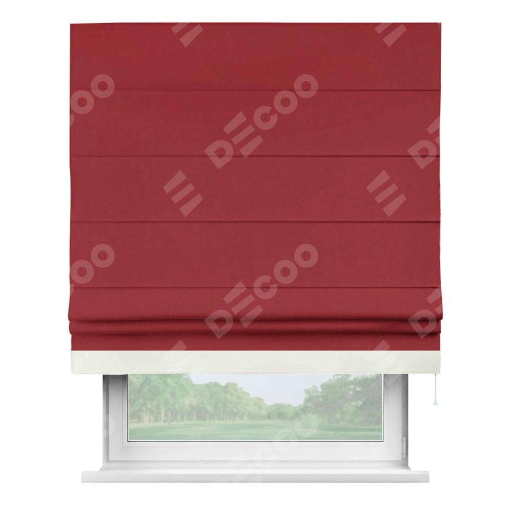 Римская штора производителя «Cortin», используется для проёма, пошита из ткани канвас красный, артикул ткани v-113. Отделка шторы кантом «Джестер» (молочный v-93), ткань для канта используется из канваса разной расцветки на выбор. Имеет универсальный механизм и подходит для монтажа: на потолок, на стену и в нишу.