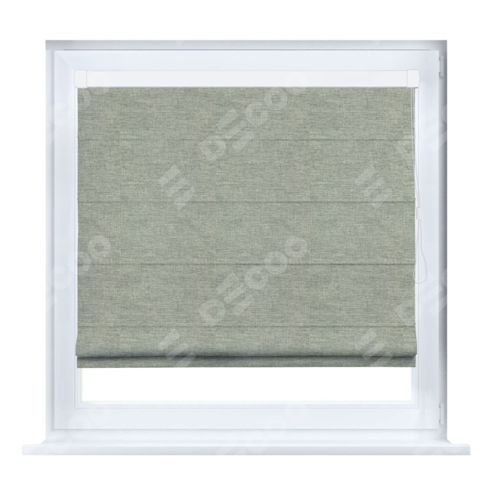 Римская штора кассетного типа, производителя «Cortin», устанавливается только на пластиковые окна и прилегает к стеклопакету, пошита из ткани лён кашемир серо-зелёный, артикул 21618.