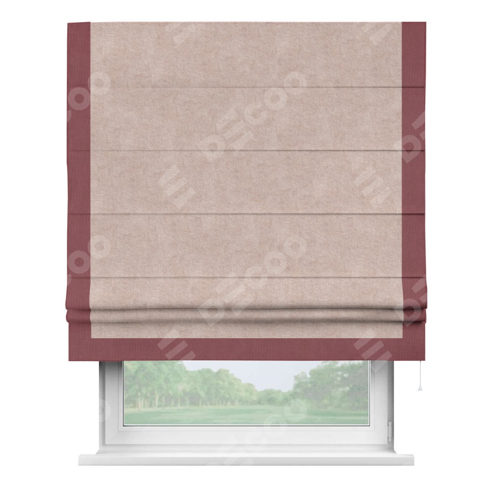 Римская штора производителя «Cortin», используется для проёма, пошита из ткани канвас пудровый, артикул ткани v-35. Отделка шторы кантом «Виктория» (ягодный v-28), ткань для канта используется из канваса разной расцветки на выбор. Имеет универсальный механизм и подходит для монтажа: на потолок, на стену и в нишу.