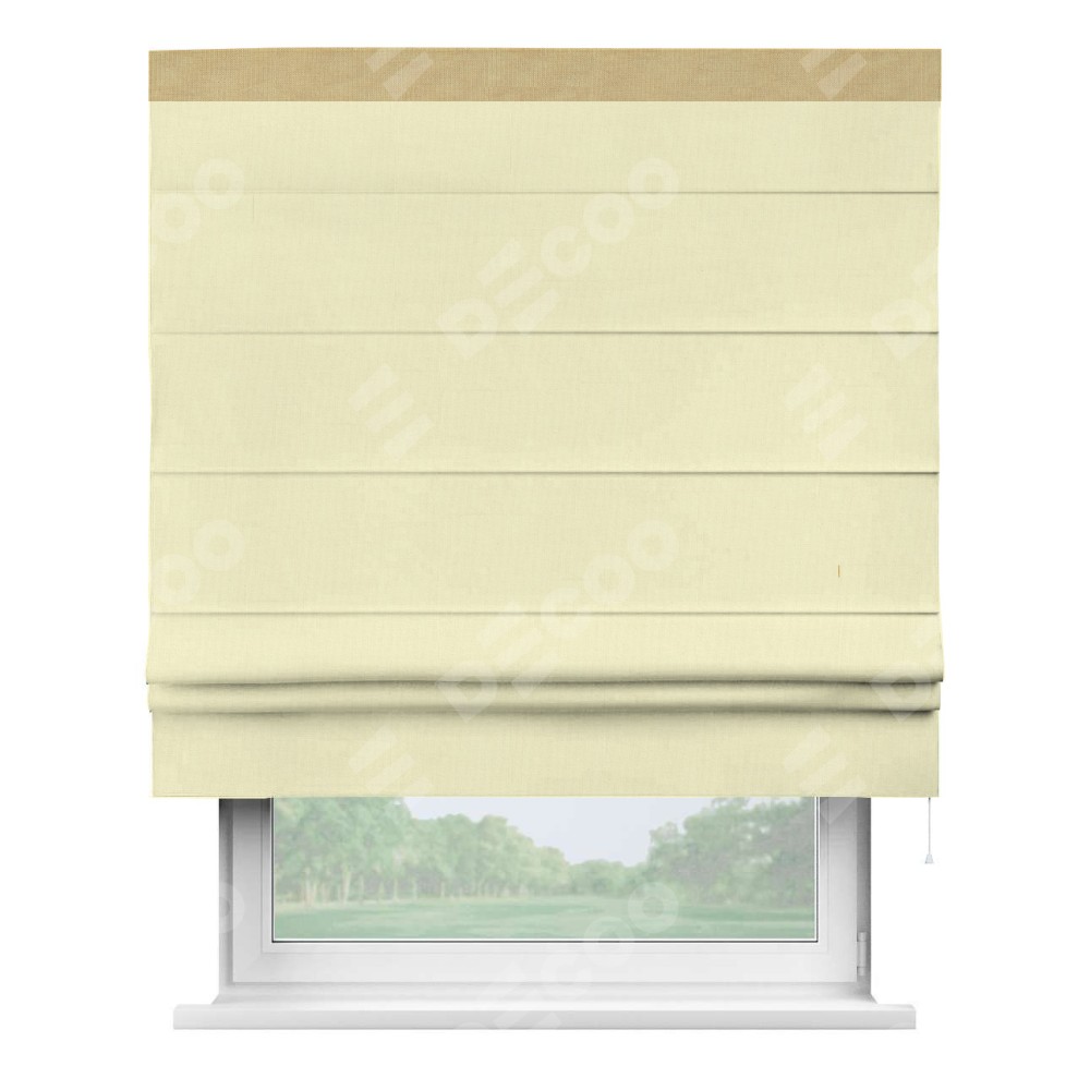 Римская штора производителя «Cortin», используется для проёма, пошита из ткани канвас светло-бежевый, артикул ткани v-250. Отделка шторы кантом «Кинг» (абрикосовый v-448), ткань для канта используется из канваса разной расцветки на выбор. Имеет универсальный механизм и подходит для монтажа: на потолок, на стену и в нишу.