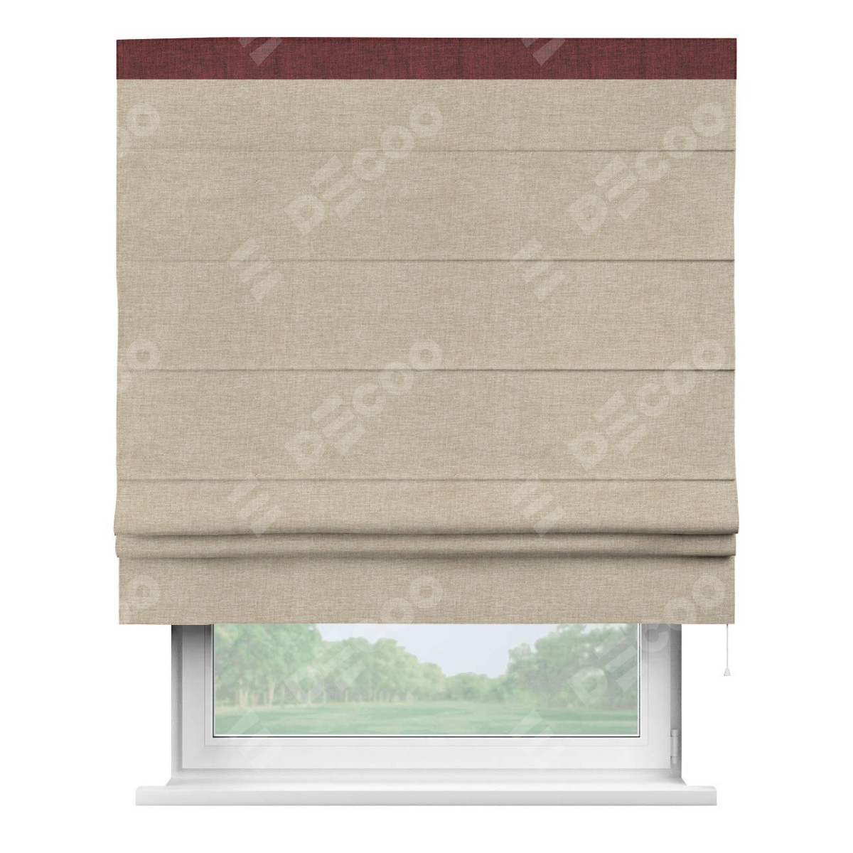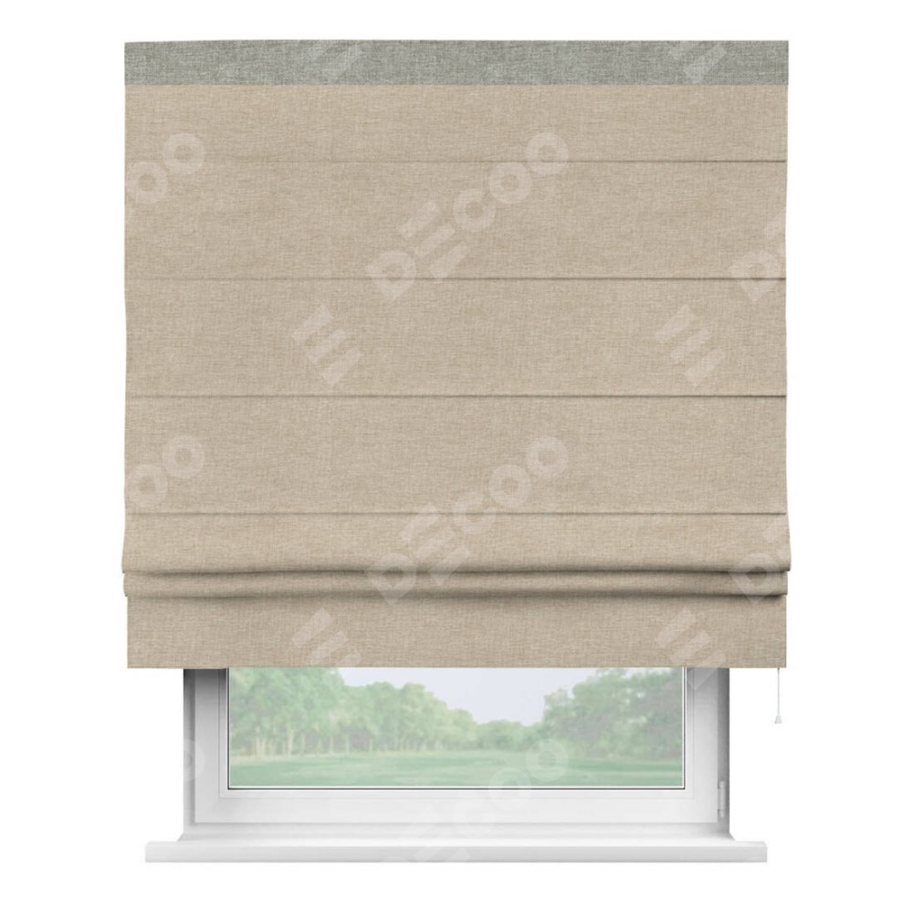 Римская штора производителя «Cortin», используется для проёма, пошита из ткани лён кашемир бежевый, артикул 17206. Отделка шторы кантом «Кинг», ткань для канта используется из льна разной расцветки на выбор. Имеет универсальный механизм и подходит для монтажа: на потолок, на стену и в нишу.
