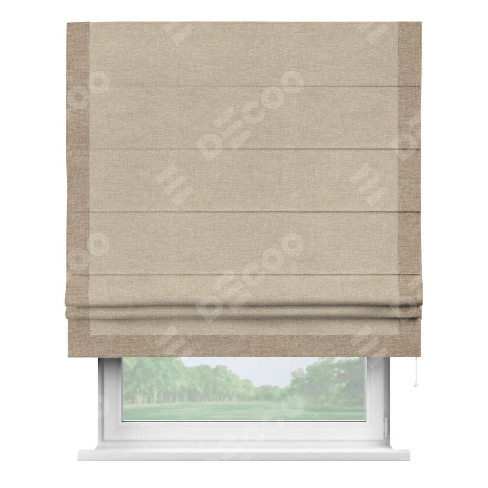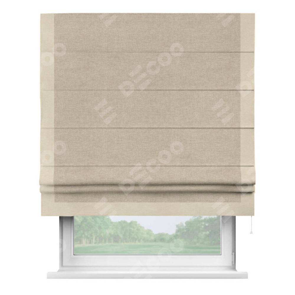 Римская штора производителя «Cortin», используется для проёма, пошита из ткани лён кашемир бежевый, артикул 17206. Отделка шторы кантом «Виктория», ткань для канта используется из льна разной расцветки на выбор. Имеет универсальный механизм и подходит для монтажа: на потолок, на стену и в нишу.