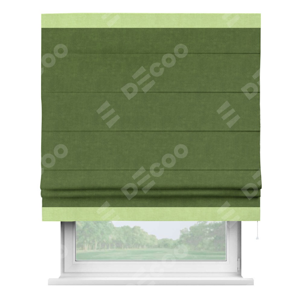 Римская штора производителя «Cortin», используется для проёма, пошита из ткани канвас трава, артикул ткани v-473. Отделка шторы кантом «Горизонт» (липовый v-207), ткань для канта используется из канваса разной расцветки на выбор. Имеет универсальный механизм и подходит для монтажа: на потолок, на стену и в нишу.