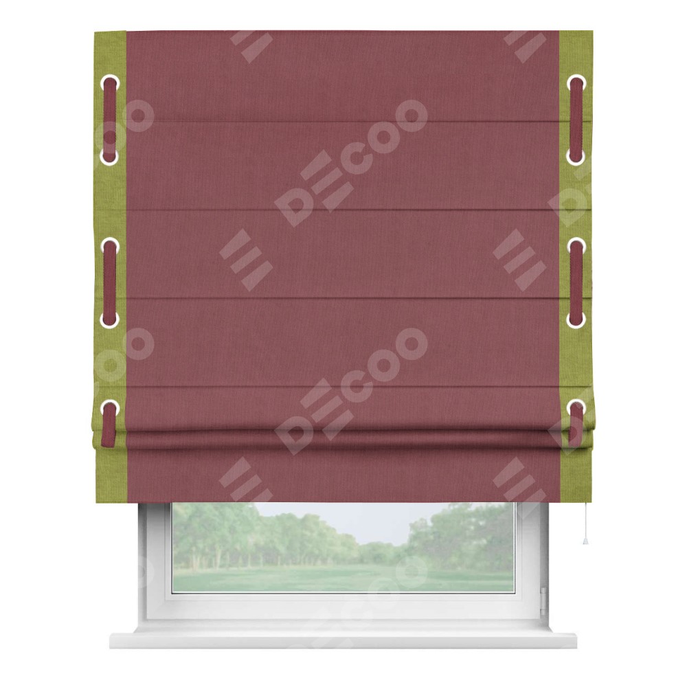 Римская штора производителя «Cortin», используется для проёма, пошита из ткани канвас ягодный, артикул ткани v-28. Отделка шторы кантом «Стрим Дуо» (зелёное яблоко v-370) на кантах расположены люверсы с пояском, ткань для канта используется из канваса разной расцветки на выбор. Ткань для пояска обычно используется из основной ткани шторы, а так же можно сделать из любой расцветки по желанию. Имеет универсальный механизм и подходит для монтажа: на потолок, на стену и в нишу.
