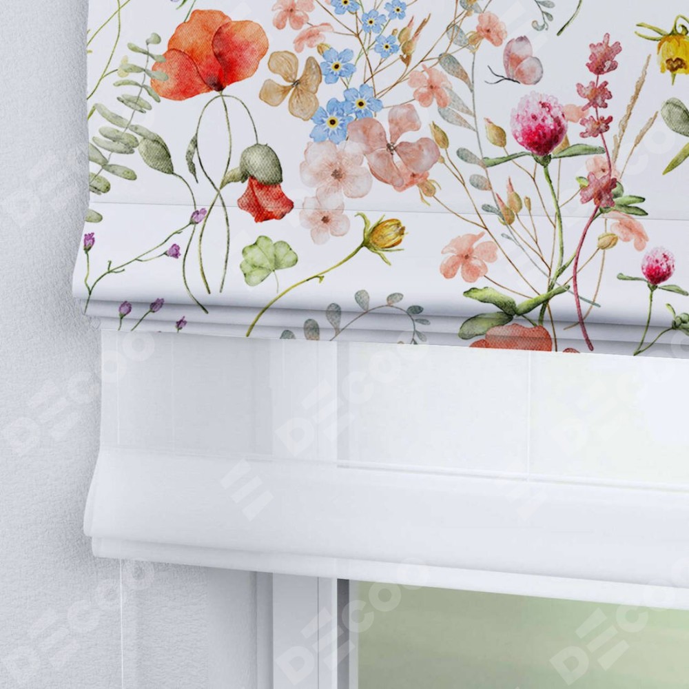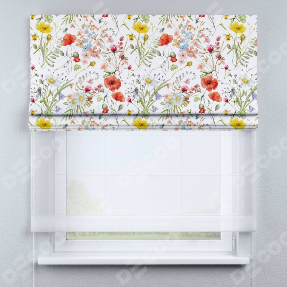 Двойная римская штора «День-ночь» от производителя Cortin предназначена для использования в проёмах. Эта штора уникальна тем, что состоит из двух полотен. На лицевой стороне находится блэкаут с нанесением сублимационной печати «Полевые маки», обеспечивающий эффективное затемнение. В комплект также входит вторая ткань — легкий белый тюль (артикул: V-01), который добавляет изящества и легкости оформлению окна. Кроме того, доступны и другие разновидности ткани тюль, выбор которых доступен по  ссылке .
