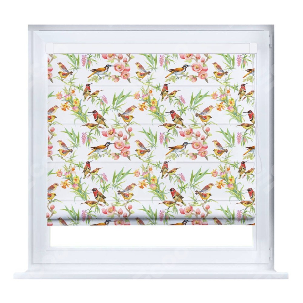 Римская штора производителя «Cortin», устанавливается на створку окна, пошита из ткани блэкаут с нанесением сублимационной печати «Певчие птички». Штора шьётся по индивидуальным размерам, для данного типа римской шторы возможная ширина от 35 до 150 см., высота до 250 см.