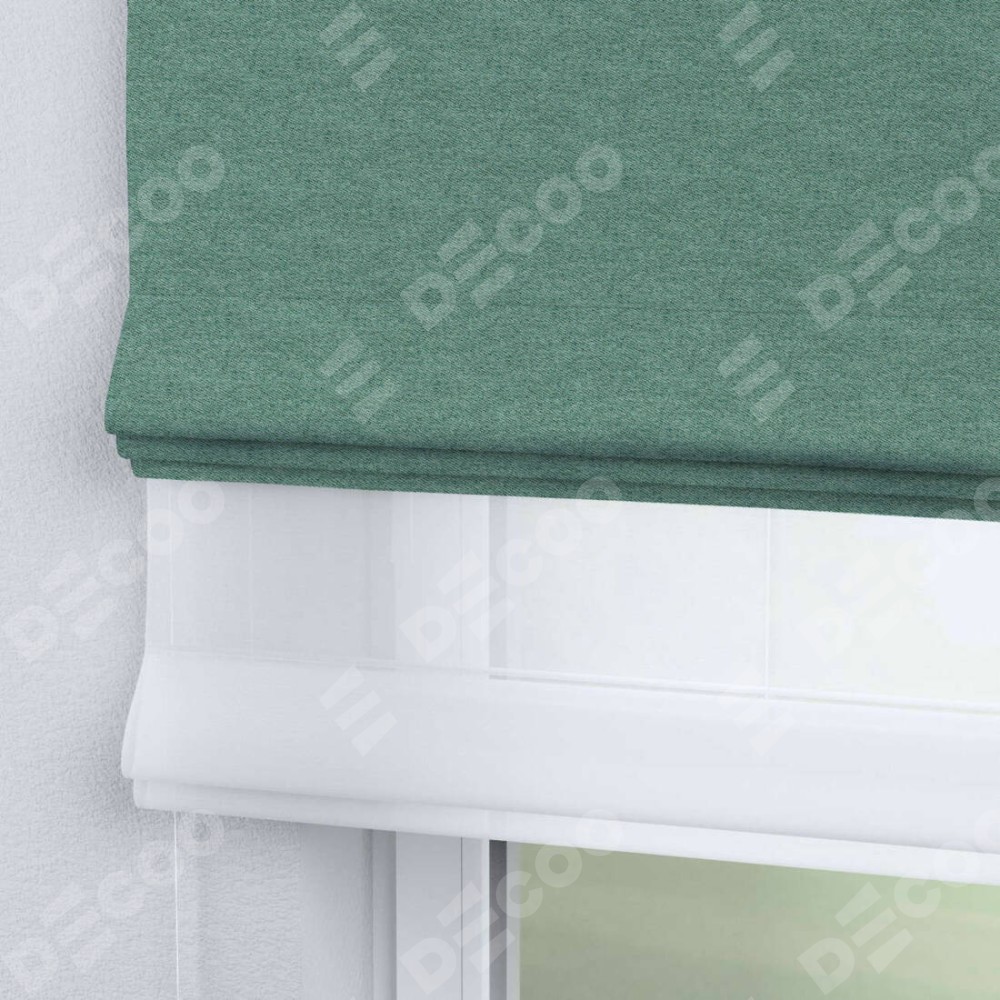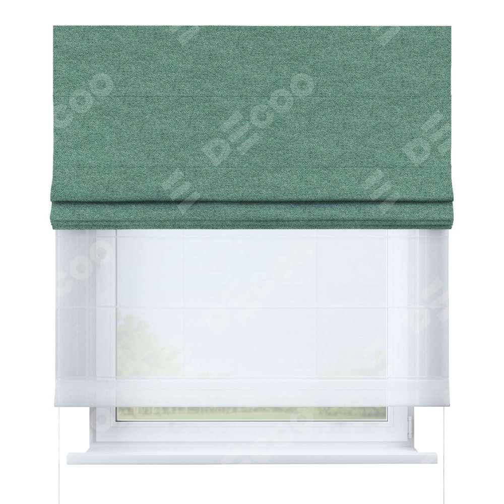 Двойная римская штора «День-ночь» от производителя Cortin предназначена для использования в проёмах. Эта штора уникальна тем, что состоит из двух полотен. На лицевой стороне находится твид блэкаут бирюзовый (артикул: 90934), обеспечивающий эффективное затемнение. В комплект также входит вторая ткань — легкий белый тюль (артикул: V-01), который добавляет изящества и легкости оформлению окна. Кроме того, доступны и другие разновидности ткани тюль, выбор которых доступен по  ссылке .