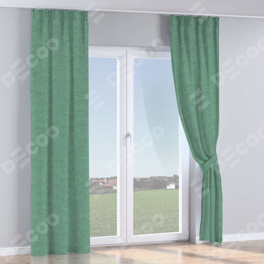 Комплект прямых штор, от производителя «Cortin», пошиты из ткани твид блэкаут бирюзовый, артикул ткани 90934. С изнаночной стороны в верхней части штор пристрачивается шторная лента с декоративными складками «Кустик». Для создания элегантных складок прямые шторы шьются по стандарту с коэффициентом 1:2 (на 100 см. ширины проёма 200 см. ширины ткани).