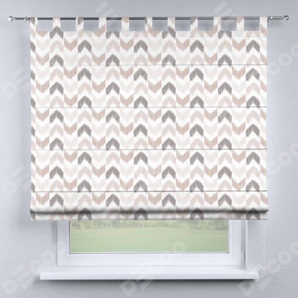Римская штора производителя «Cortin», используется для проёма, пошита из ткани блэкаут с нанесением сублимационной печати «Икат стрелки». Данная модель пошита на петлях, комплектуется на выбор круглым карнизом и подходит для монтажа на стену. Римская штора на петлях имеет простую систему регулировки высоты, отличительным преимуществом данной модели является простой способ монтажа. Достаточно повесить ее на трубу и штора готова!
