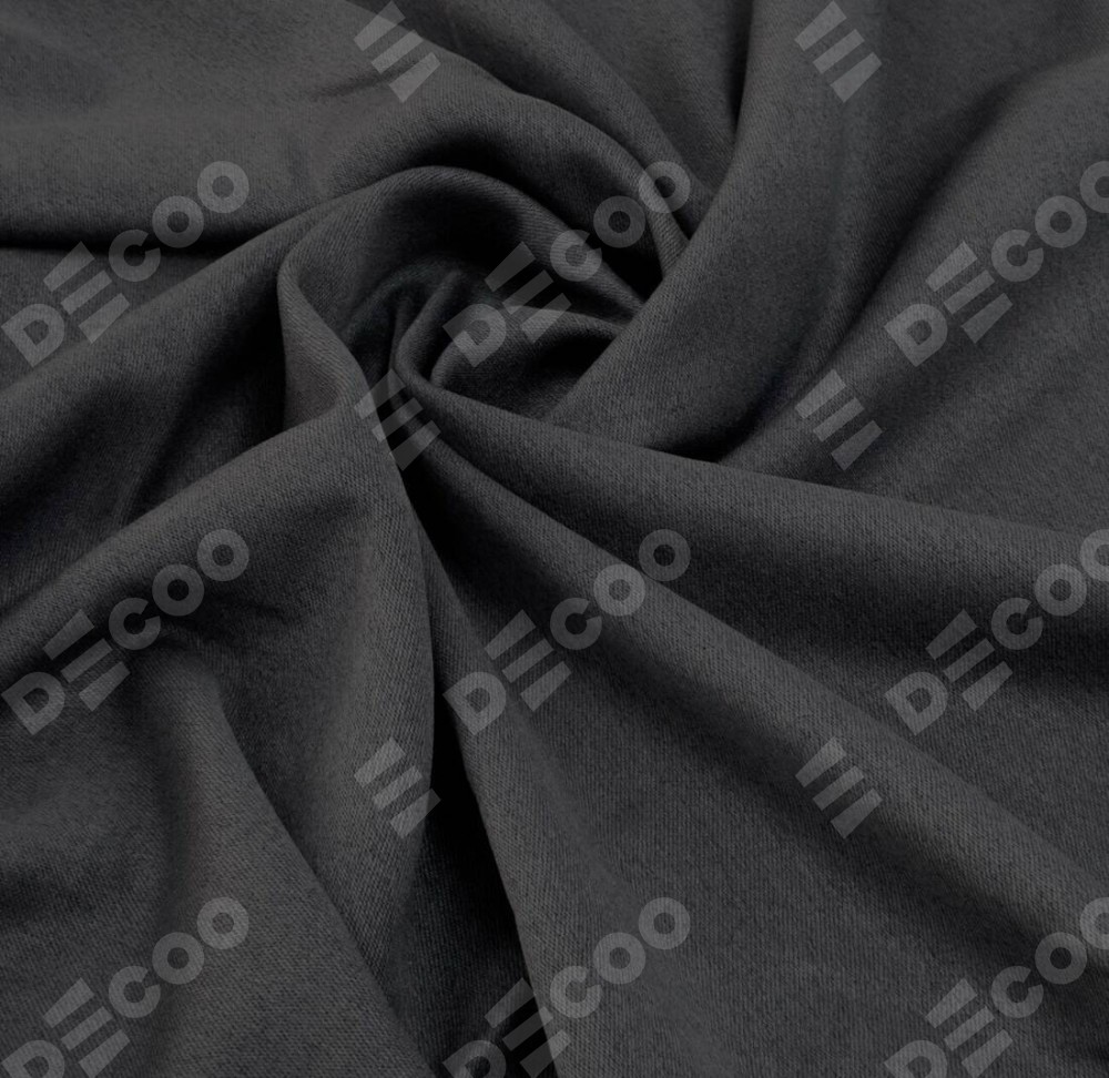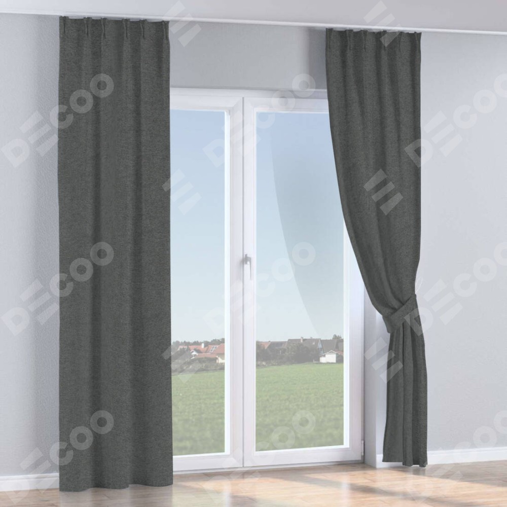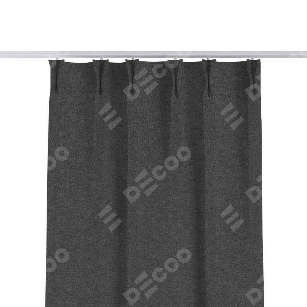 Комплект прямых штор, от производителя «Cortin», пошиты из ткани твид блэкаут тёмно-серый, артикул ткани 90938. С изнаночной стороны в верхней части штор пристрачивается шторная лента с декоративными складками «Кустик». Для создания элегантных складок прямые шторы шьются по стандарту с коэффициентом 1:2 (на 100 см. ширины проёма 200 см. ширины ткани).