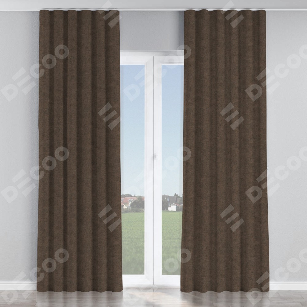 Комплект прямых штор, от производителя «Cortin», пошиты из ткани твид блэкаут тёмно-коричневый, артикул ткани 90933. С изнаночной стороны в верхней части штор пристрачивается шторная лента с декоративными складками «Волна». Для создания элегантных складок прямые шторы шьются по стандарту с коэффициентом 1:2 (на 100 см. ширины проёма 200 см. ширины ткани).