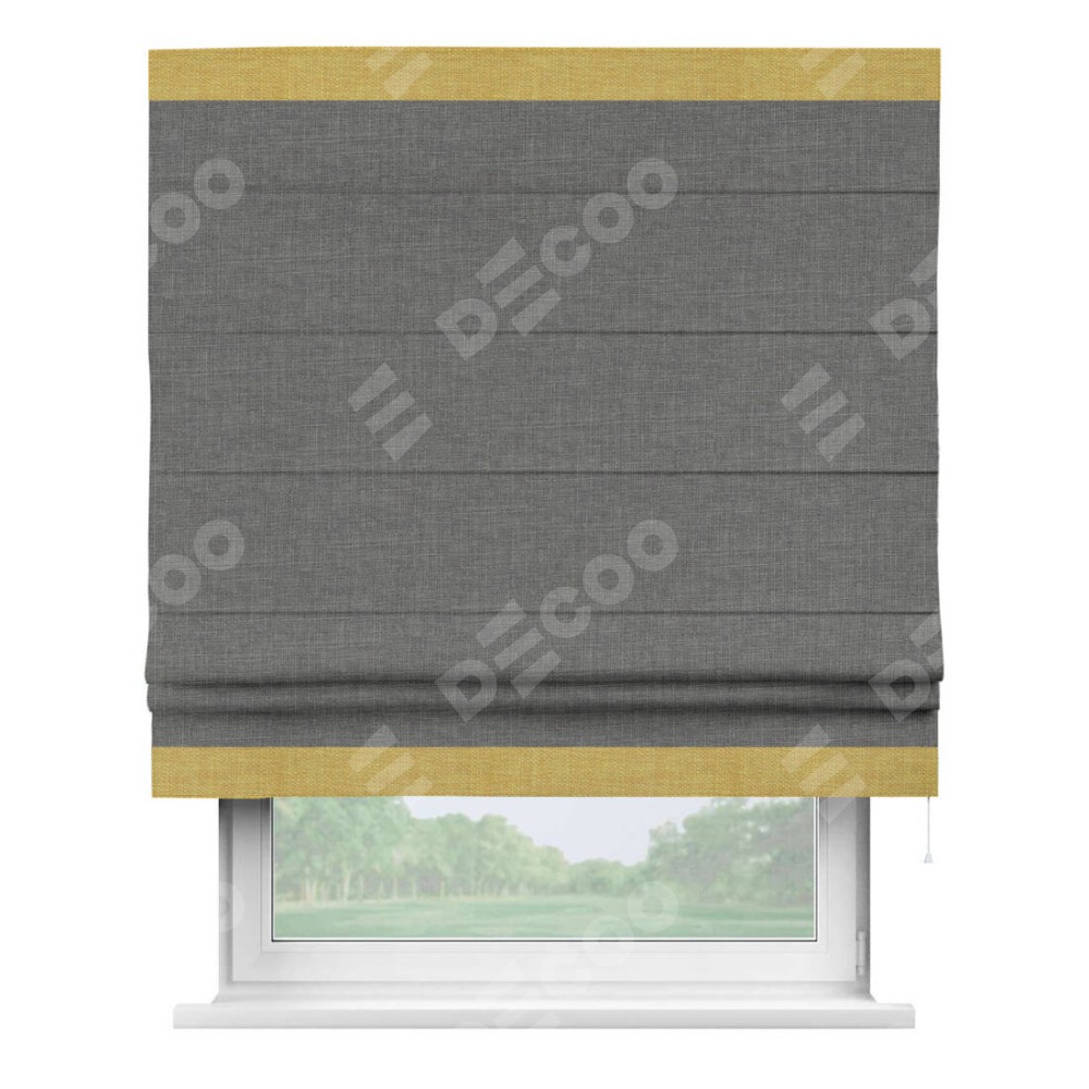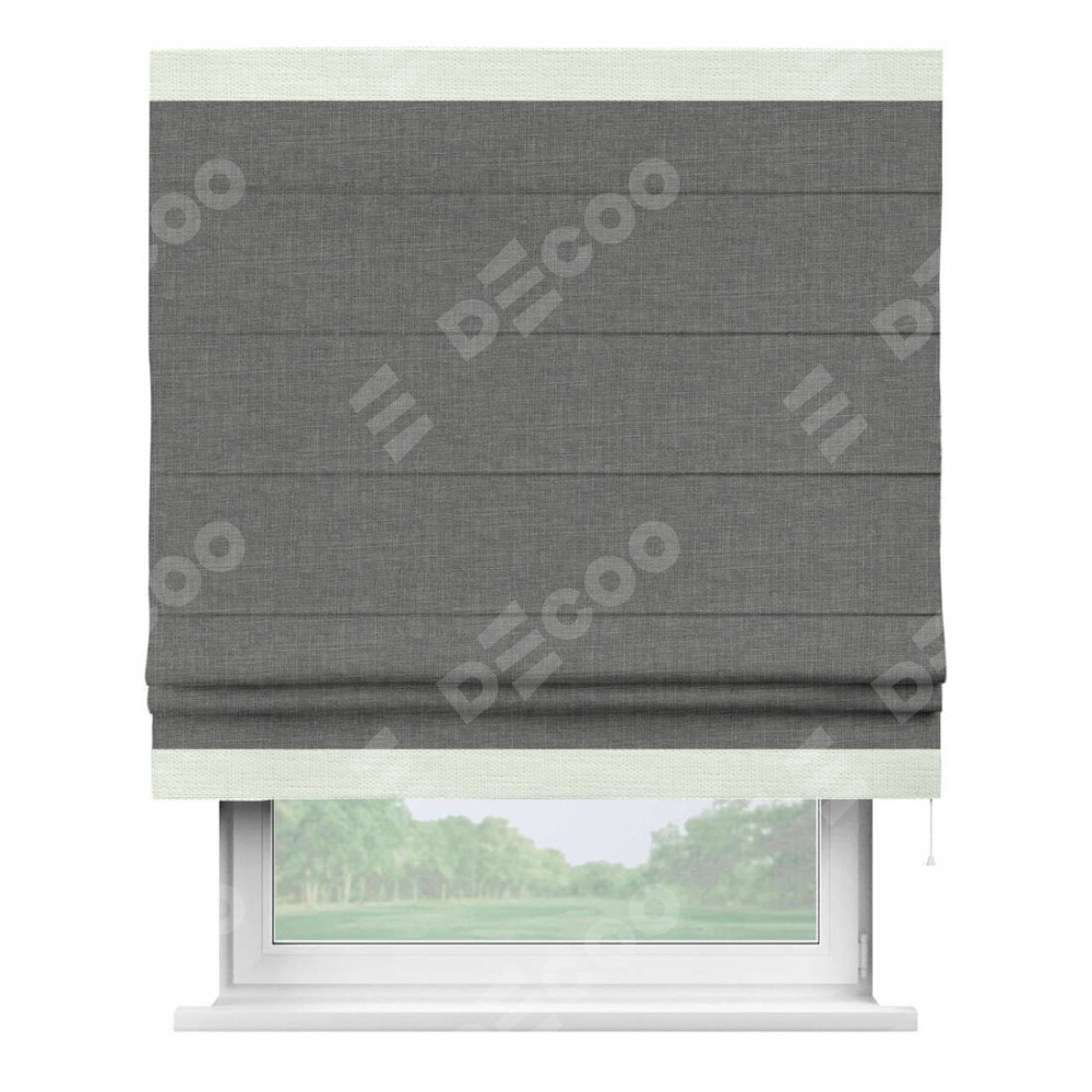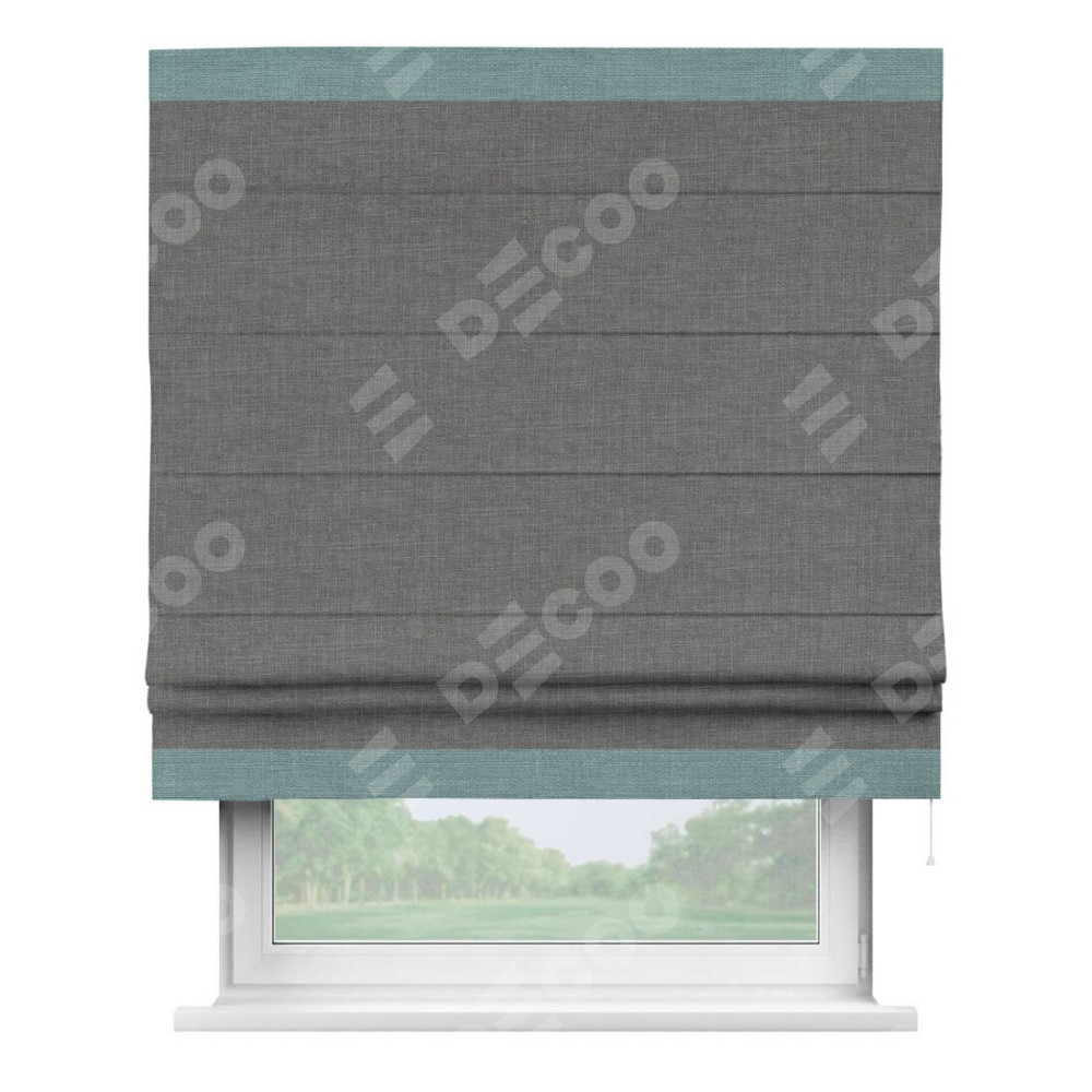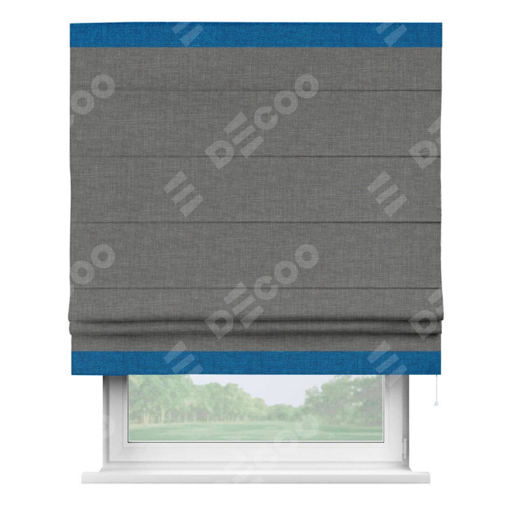 Римская штора производителя «Cortin», используется для проёма, пошита из ткани лён тёмно-серый, артикул 7441. Отделка шторы кантом «Горизонт», ткань для канта используется из льна разной расцветки на выбор. Имеет универсальный механизм и подходит для монтажа: на потолок, на стену и в нишу.