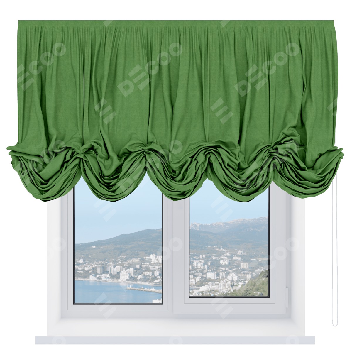 Австрийская штора производителя «Cortin», используется для проёма, пошита из ткани вельвет салатовый, артикул ткани 87072. Имеет универсальный механизм и подходит для монтажа: на потолок и на стену.