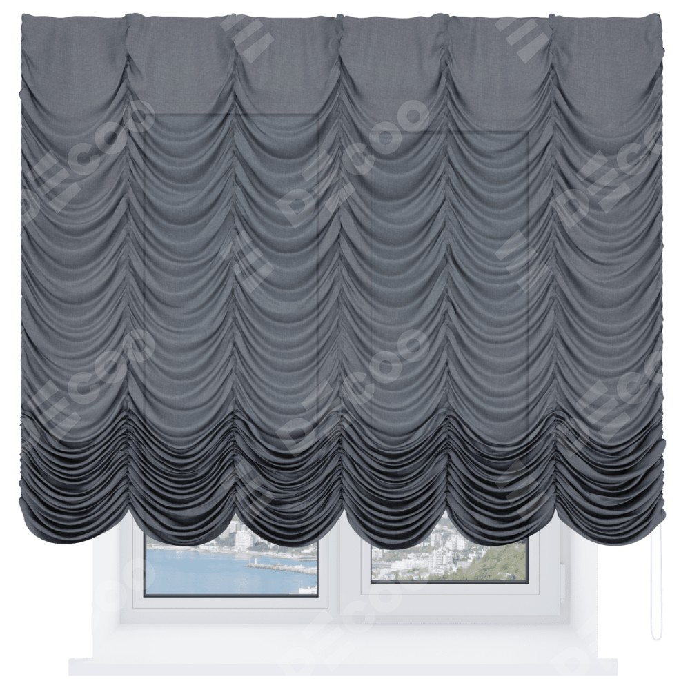 Французская штора производителя «Cortin», используется для проёма, пошита из ткани лён тёмно-серый, артикул ткани 7441. Имеет универсальный механизм и подходит для монтажа: на потолок и на стену.