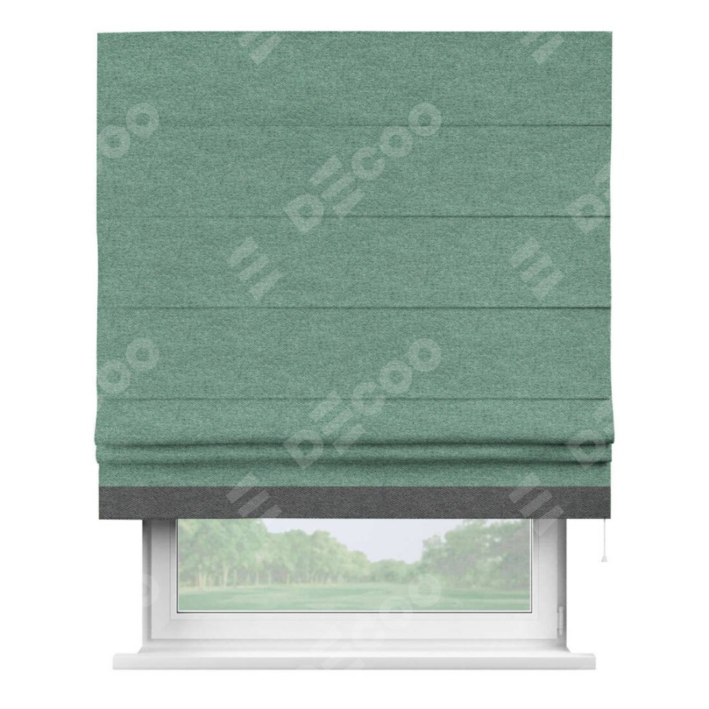 Римская штора производителя «Cortin», используется для проёма, пошита из ткани твид блэкаут бирюзовый, артикул 90934. Отделка шторы кантом «Джестер», ткань для канта используется из твида разной расцветки на выбор. Имеет универсальный механизм и подходит для монтажа: на потолок, на стену и в нишу.