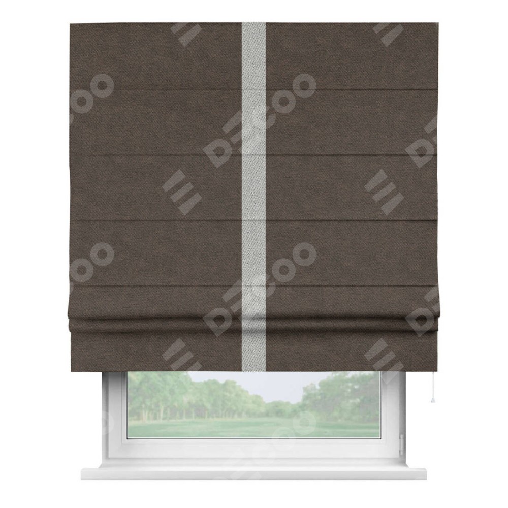 Римская штора производителя «Cortin», используется для проёма, пошита из ткани твид блэкаут тёмно-коричневый, артикул 90933. Отделка шторы кантом «Хайвэй», ткань для канта используется из твида разной расцветки на выбор. Имеет универсальный механизм и подходит для монтажа: на потолок, на стену и в нишу.