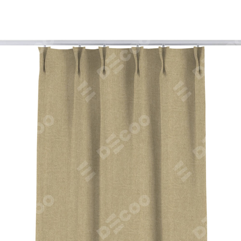 Комплект прямых штор, от производителя «Cortin», пошиты из ткани лён димаут песочный, артикул ткани 16256. С изнаночной стороны в верхней части штор пристрачивается шторная лента с декоративными складками «Кустик». Для создания элегантных складок прямые шторы шьются по стандарту с коэффициентом 1:2 (на 100 см. ширины проёма 200 см. ширины ткани).