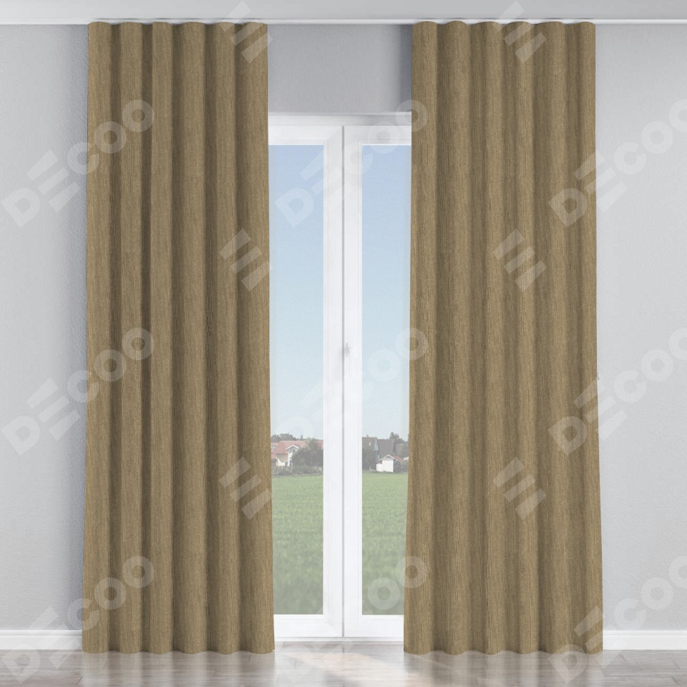 Комплект прямых штор, от производителя «Cortin», пошиты из ткани лён димаут тёмно-бежевый, артикул ткани 16261. С изнаночной стороны в верхней части штор пристрачивается шторная лента с декоративными складками «Волна». Для создания элегантных складок прямые шторы шьются по стандарту с коэффициентом 1:2 (на 100 см. ширины проёма 200 см. ширины ткани).