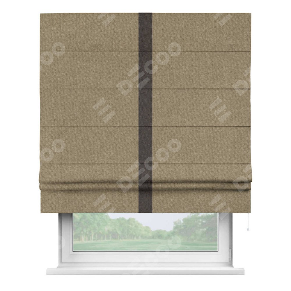 Римская штора пошита из ткани лён димаут тёмно-бежевый, артикул: 16261, с отделкой кантом «Хайвэй» представляет собой уникальное и смелое дизайнерское решение, где кант расположен вертикально посередине шторы. Этот дизайн не только выделяет штору среди других вариантов оформления окон, но и создает интересный визуальный акцент, привлекая внимание к центру окна и разделяя штору на визуальные зоны. Такой нестандартный подход добавляет динамичности интерьеру и может быть использован для подчеркивания особенностей оформления помещения.