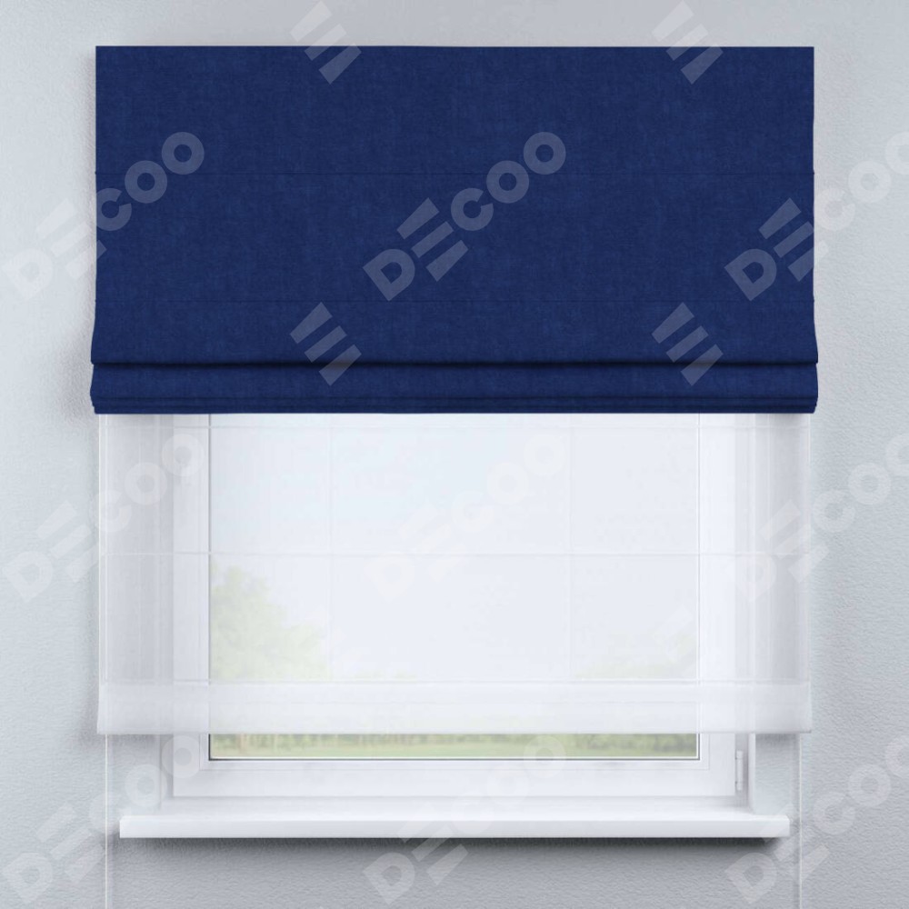 Двойная римская штора «День-ночь» от производителя Cortin предназначена для использования в проёмах. Эта штора уникальна тем, что состоит из двух полотен. На лицевой стороне находится канвас синий электрик (артикул: v-355), обеспечивающий мягкое затемнение. В комплект также входит вторая ткань — легкий белый тюль (артикул: V-01), который добавляет изящества и легкости оформлению окна. Кроме того, доступны и другие разновидности ткани тюль, выбор которых доступен по  ссылке .