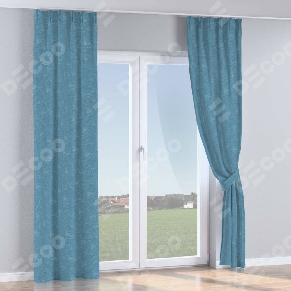 Комплект прямых штор, от производителя «Cortin», пошиты из ткани софт мрамор голубой, артикул ткани 93580. С изнаночной стороны в верхней части штор пристрачивается шторная лента с декоративными складками «Кустик». Для создания элегантных складок прямые шторы шьются по стандарту с коэффициентом 1:2 (на 100 см. ширины проёма 200 см. ширины ткани).