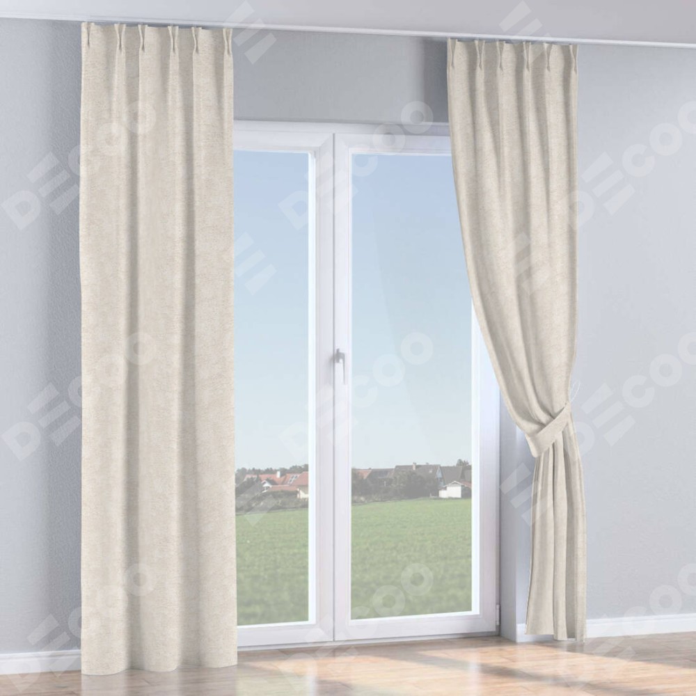 Комплект прямых штор, от производителя «Cortin», пошиты из ткани софт мрамор кремовый, артикул ткани 93574. С изнаночной стороны в верхней части штор пристрачивается шторная лента с декоративными складками «Кустик». Для создания элегантных складок прямые шторы шьются по стандарту с коэффициентом 1:2 (на 100 см. ширины проёма 200 см. ширины ткани).