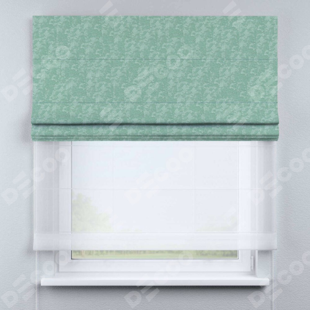 Двойная римская штора «День-ночь» от производителя Cortin предназначена для использования в проёмах. Эта штора уникальна тем, что состоит из двух полотен. На лицевой стороне находится софт мрамор светло-зелёный (артикул: 93579), обеспечивающий эффективное затемнение. В комплект также входит вторая ткань — легкий белый тюль (артикул: V-01), который добавляет изящества и легкости оформлению окна. Кроме того, доступны и другие разновидности ткани тюль, выбор которых доступен по  ссылке .