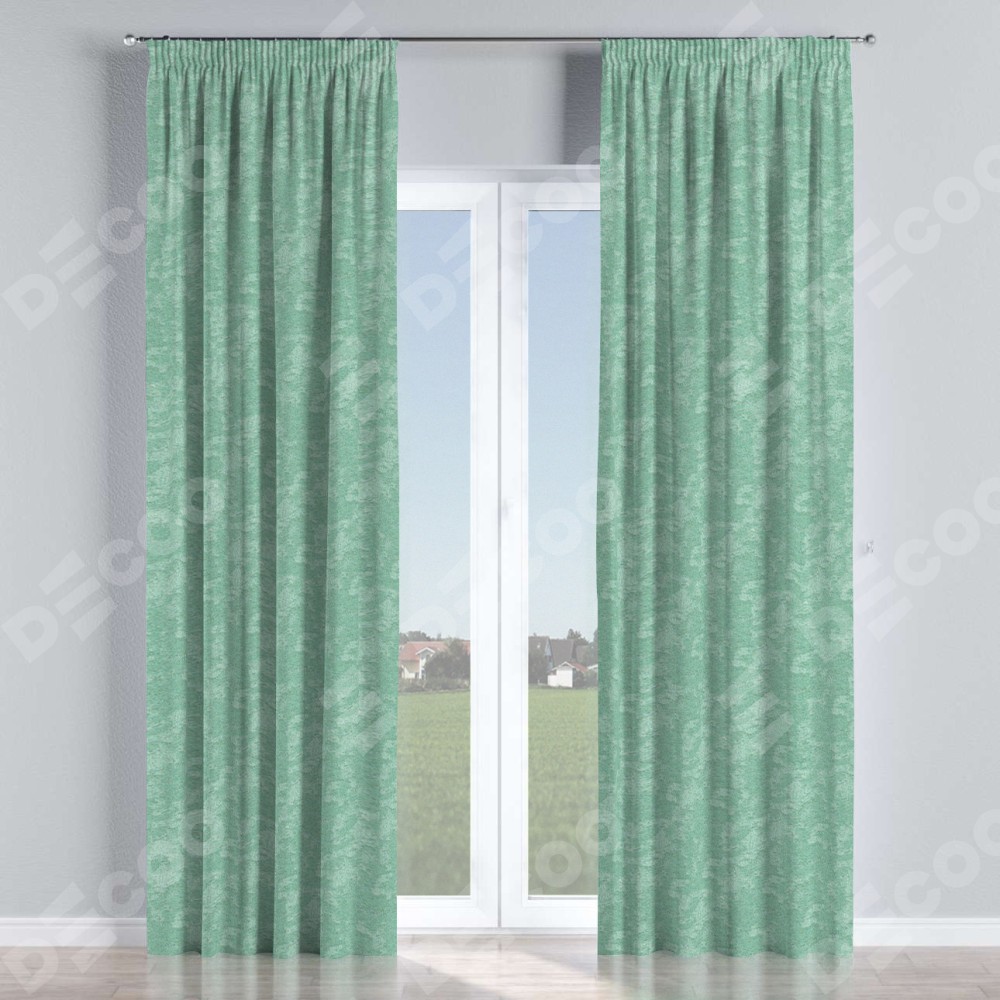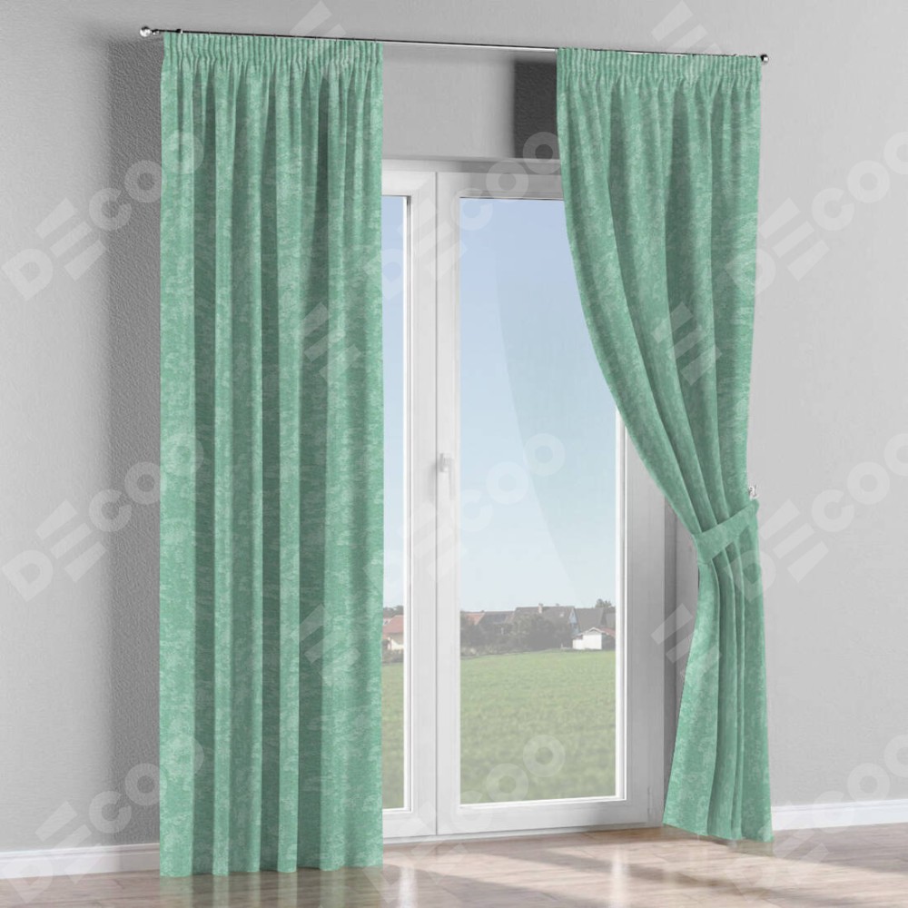 Комплект прямых штор, от производителя «Cortin», пошиты из ткани софт мрамор светло-зелёный, артикул ткани 93579. С изнаночной стороны в верхней части штор пристрачивается шторная лента с декоративными складками «Карандаш». Для создания элегантных складок прямые шторы шьются по стандарту с коэффициентом 1:2 (на 100 см. ширины проёма 200 см. ширины ткани).