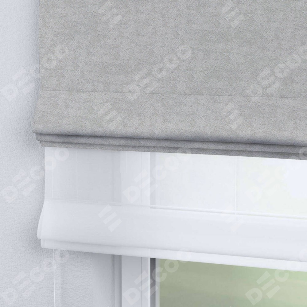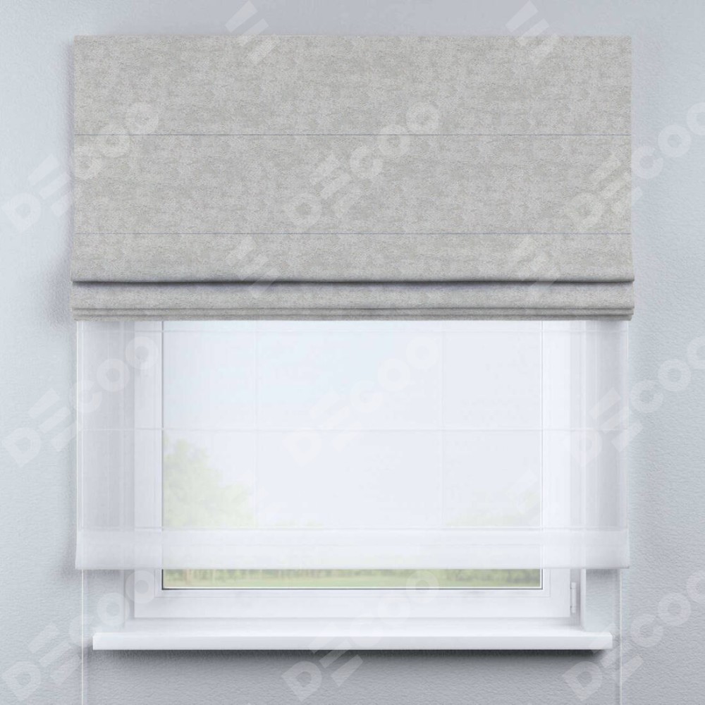 Двойная римская штора «День-ночь» от производителя Cortin предназначена для использования в проёмах. Эта штора уникальна тем, что состоит из двух полотен. На лицевой стороне находится софт мрамор светло-серый (артикул: 93582), обеспечивающий эффективное затемнение. В комплект также входит вторая ткань — легкий белый тюль (артикул: V-01), который добавляет изящества и легкости оформлению окна. Кроме того, доступны и другие разновидности ткани тюль, выбор которых доступен по  ссылке .