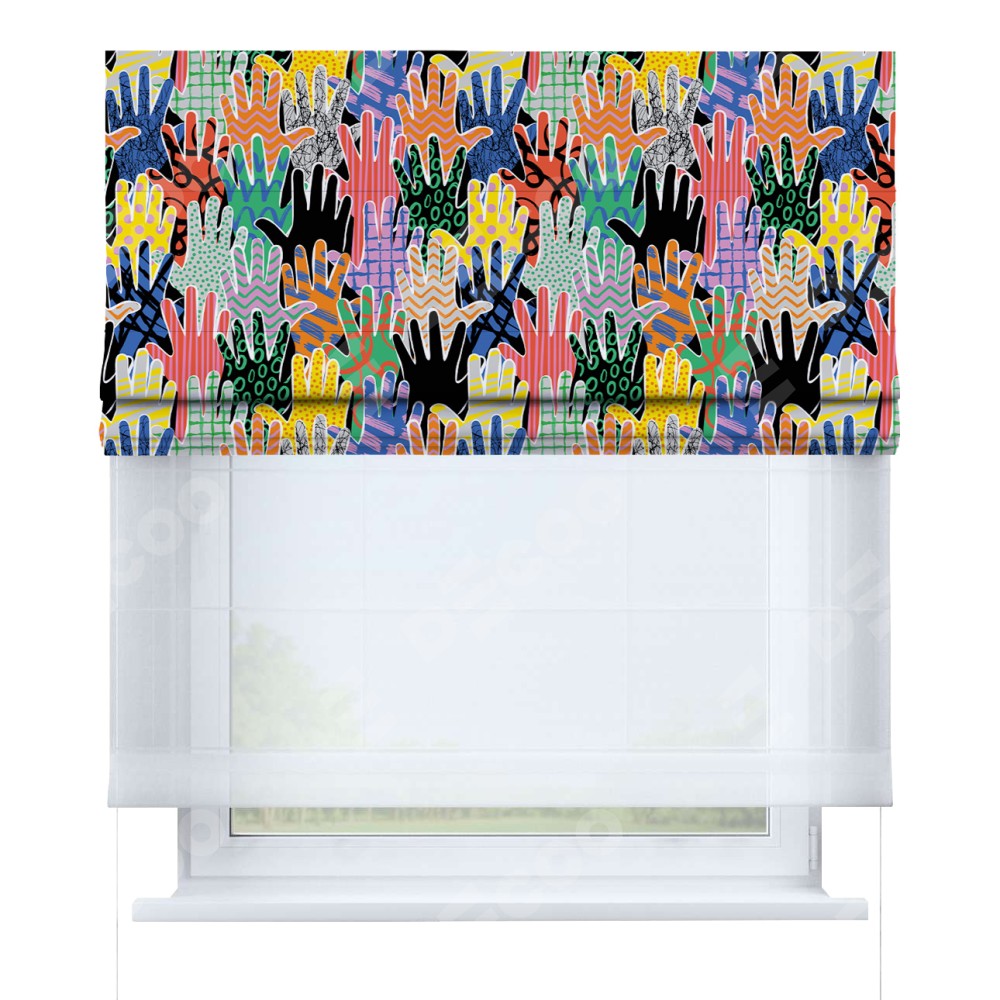 Двойная римская штора «День-ночь» от производителя Cortin предназначена для использования в проёмах. Эта штора уникальна тем, что состоит из двух полотен. На лицевой стороне находится блэкаут с нанесением сублимационной печати «Коллаж поп-арт», обеспечивающий эффективное затемнение. В комплект также входит вторая ткань — легкий белый тюль (артикул: V-01), который добавляет изящества и легкости оформлению окна. Кроме того, доступны и другие разновидности ткани тюль, выбор которых доступен по  ссылке .