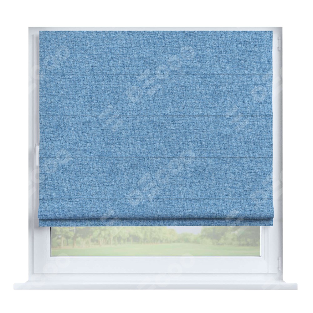 Римская штора производителя «Cortin», устанавливается на створку окна, пошита из ткани рогожка димаут голубой, артикул 91025. Штора шьётся по индивидуальным размерам, для данного типа римской шторы возможная ширина от 35 до 150 см., высота до 250 см.