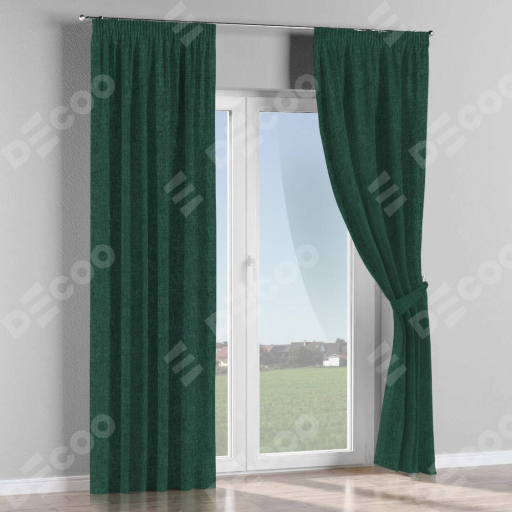 Комплект прямых штор, от производителя «Cortin», пошиты из ткани рогожка димаут тёмно-зелёный, артикул ткани 91022. С изнаночной стороны в верхней части штор пристрачивается шторная лента с декоративными складками «Карандаш». Для создания элегантных складок прямые шторы шьются по стандарту с коэффициентом 1:2 (на 100 см. ширины проёма 200 см. ширины ткани).