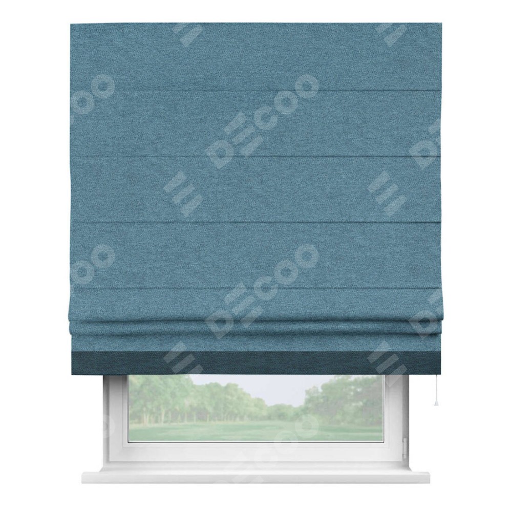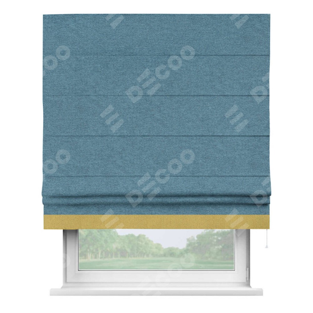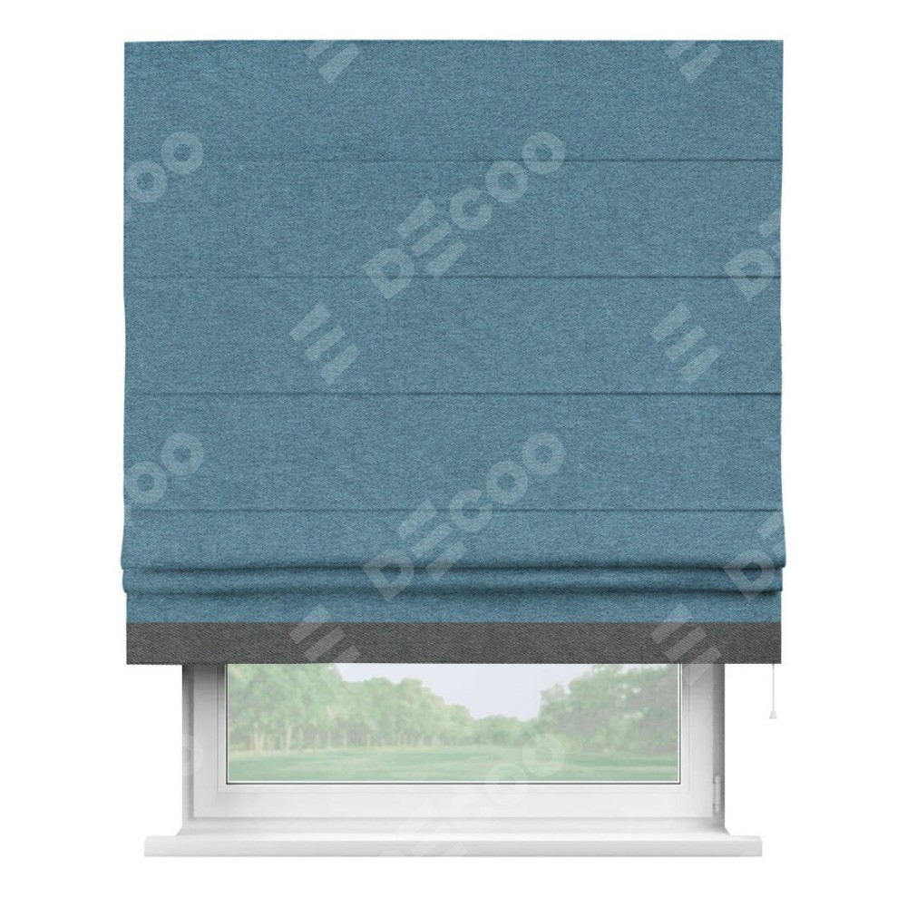 Римская штора пошита из ткани твид блэкаут светло-синий, артикул: 90935, с отделкой кантом «Джестер» выделяется своей уникальной особенностью — кантом, расположенным только снизу шторы. Этот дизайн добавляет оригинальности и игривости оконному оформлению, делая акцент на нижней части шторы и создавая интересный визуальный эффект. Отделка кантом на нижнем крае не только служит эстетической функции, но и способствует увеличению прочности и износостойкости ткани в этом месте.