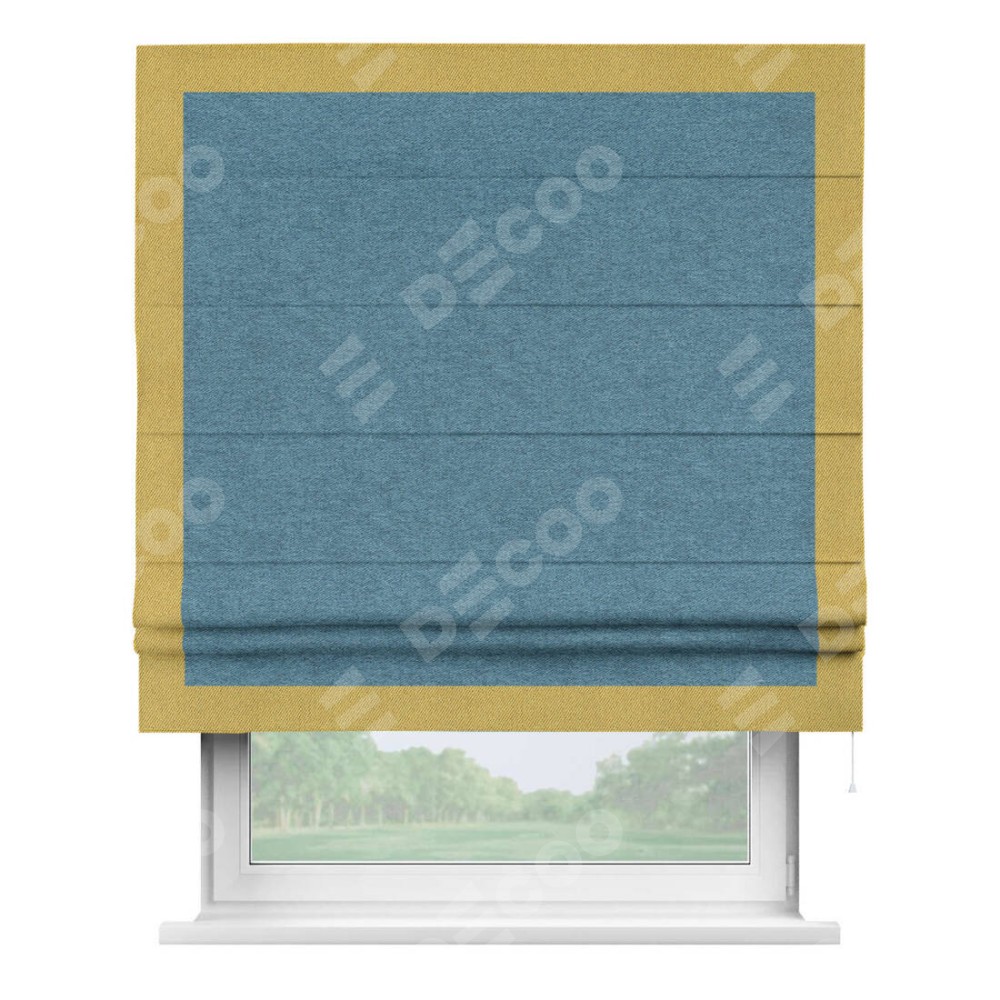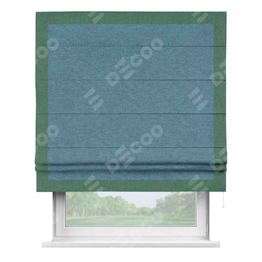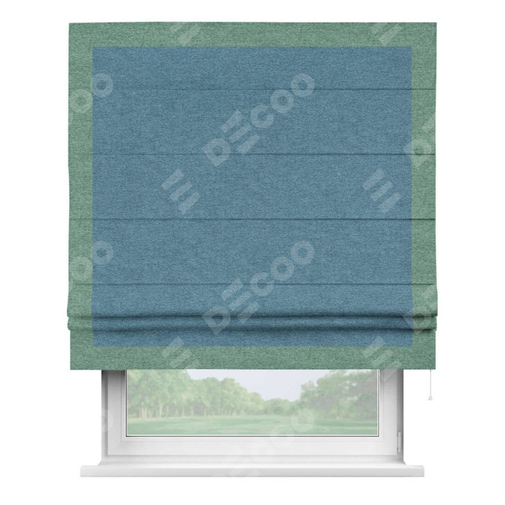 Римская штора пошита из ткани твид блэкаут светло-синий, артикул: 90935, с отделкой кантом «Чесс» отличается своей уникальной деталью — наличием канта не только по бокам и снизу, но и сверху по всем краям шторы. Это придает шторе особенно аккуратный и завершенный вид, делая акцент на границах и форме шторы. Отделка кантом по всему периметру шторы усиливает её декоративные качества и подчеркивает строгую геометрию, что может быть особенно актуально для современных и минималистичных интерьеров.