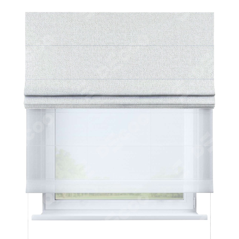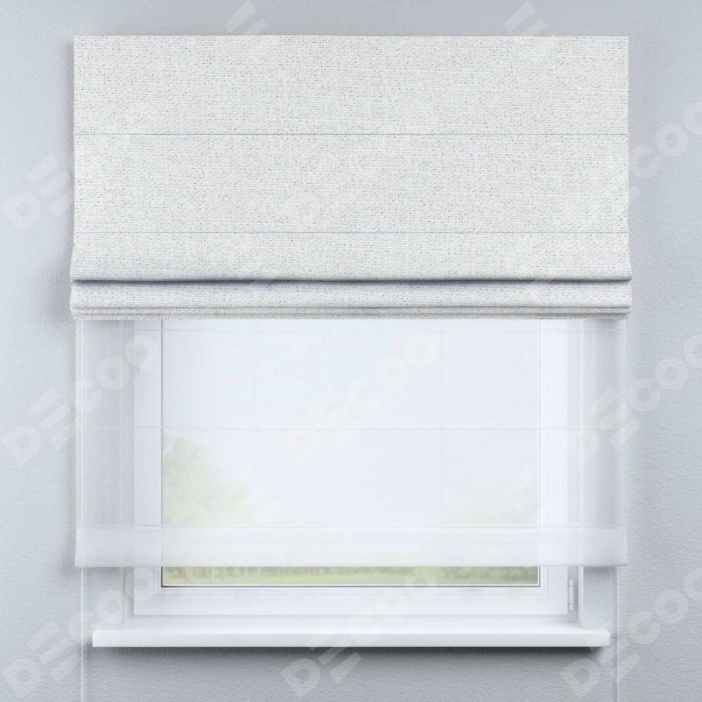 Двойная римская штора «День-ночь» от производителя Cortin предназначена для использования в проёмах. Эта штора уникальна тем, что состоит из двух полотен. На лицевой стороне находится лён шампань (артикул: 91399), обеспечивающий эффективное затемнение. В комплект также входит вторая ткань — легкий белый тюль (артикул: V-01), который добавляет изящества и легкости оформлению окна. Кроме того, доступны и другие разновидности ткани тюль, выбор которых доступен по  ссылке .