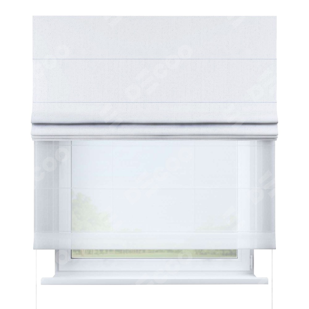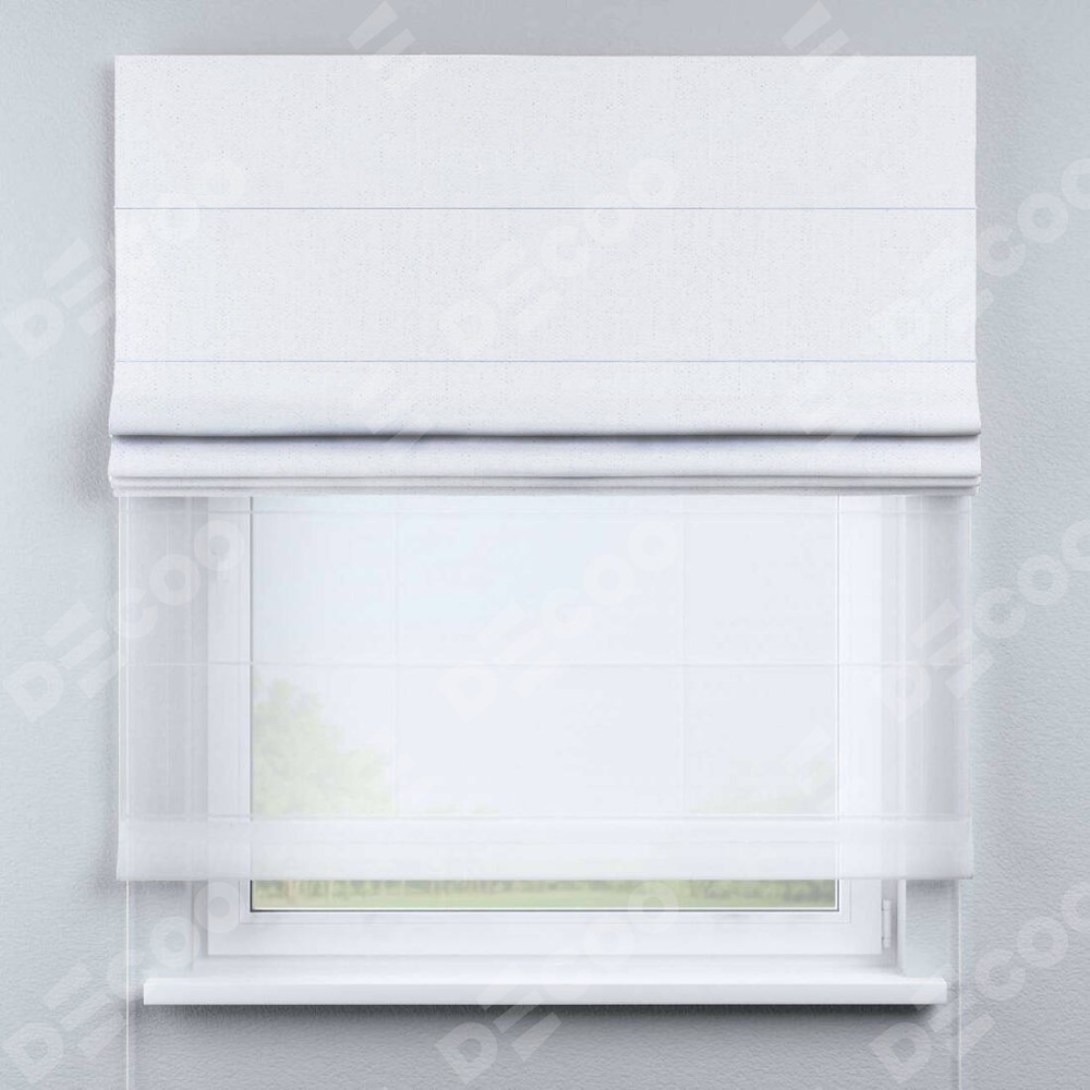 Двойная римская штора «День-ночь» от производителя Cortin предназначена для использования в проёмах. Эта штора уникальна тем, что состоит из двух полотен. На лицевой стороне находится лён белоснежный (артикул: 95632), обеспечивающий эффективное затемнение. В комплект также входит вторая ткань — легкий белый тюль (артикул: V-01), который добавляет изящества и легкости оформлению окна. Кроме того, доступны и другие разновидности ткани тюль, выбор которых доступен по  ссылке .