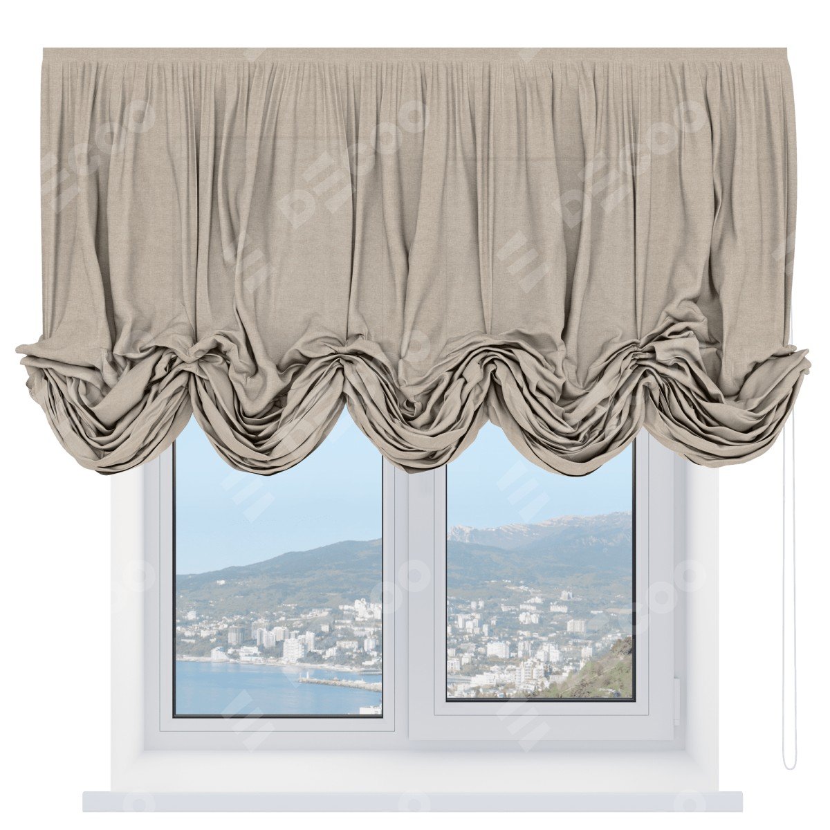 Австрийская штора производителя «Cortin», используется для проёма, пошита из ткани лён кашемир бежевый, артикул ткани 17206. Имеет универсальный механизм и подходит для монтажа: на потолок и на стену.