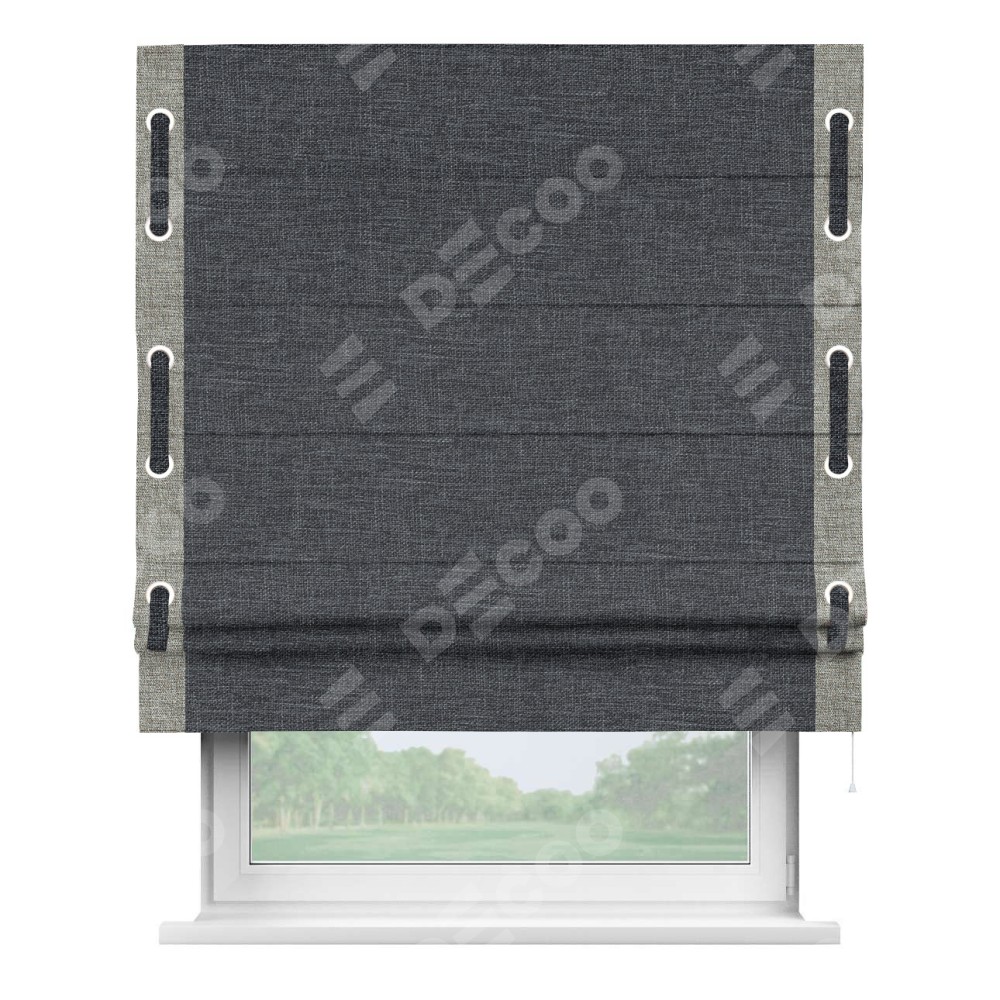 Римская штора «Кортин» для проёма, рогожка димаут графит, с кантом Стрим Дуо (люверсы с пояском)