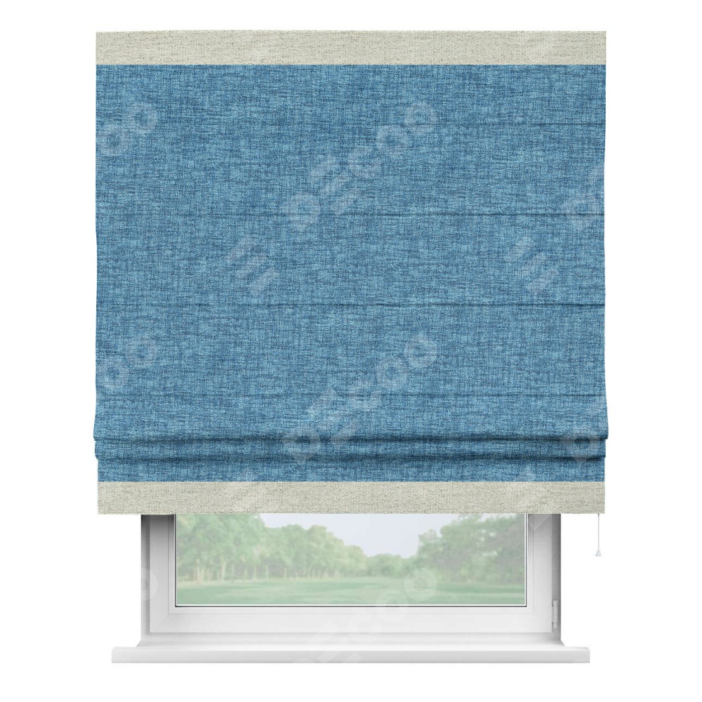Римская штора пошита из ткани рогожка димаут джинс, артикул: 91026, с отделкой кантом «Горизонт» предлагает уникальное дизайнерское решение, при котором кант располагается только вверху и снизу шторы. Такое решение делает акцент на горизонтальных линиях, визуально расширяя пространство и придавая окну более строгий и организованный вид. Отделка кантом в этих ключевых местах не только украшает штору, но и способствует её долговечности, защищая наиболее уязвимые к износу края.