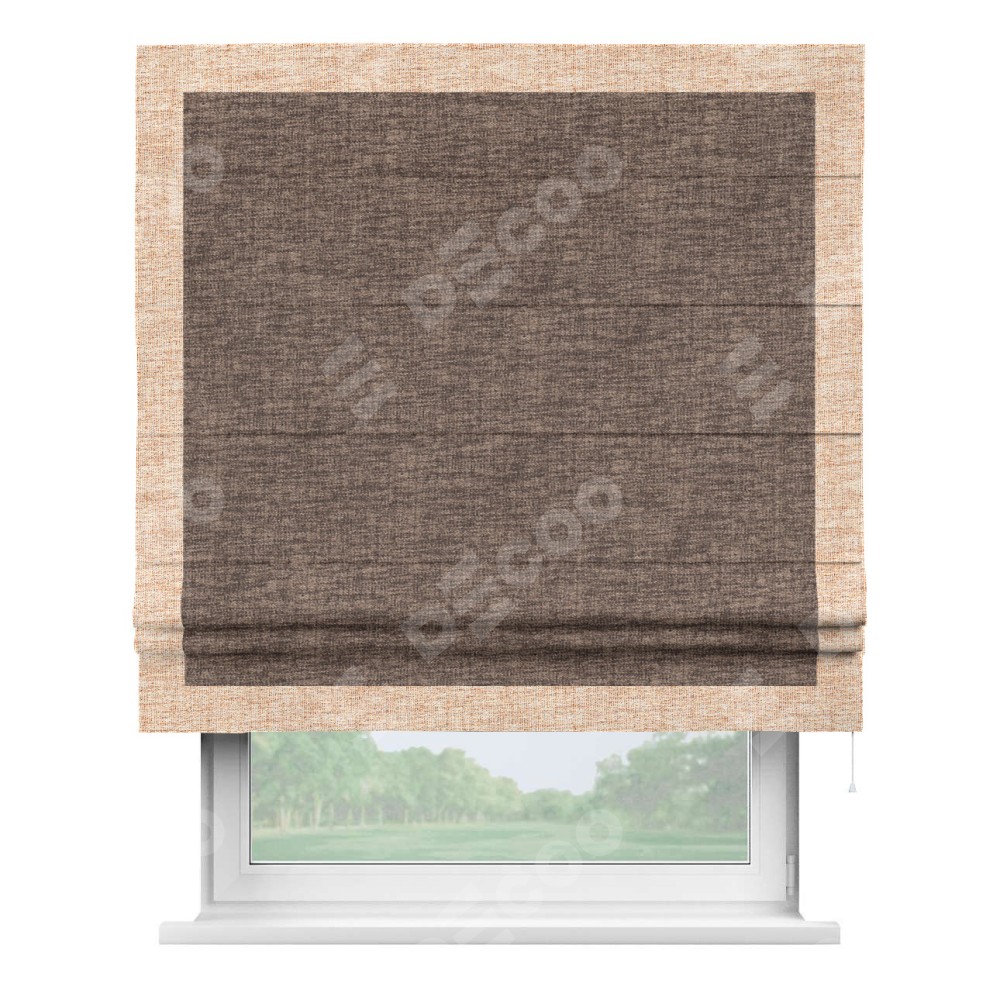 Римская штора пошита из ткани рогожка димаут коричневый, артикул: 91018, с отделкой кантом «Чесс» отличается своей уникальной деталью — наличием канта не только по бокам и снизу, но и сверху по всем краям шторы. Это придает шторе особенно аккуратный и завершенный вид, делая акцент на границах и форме шторы. Отделка кантом по всему периметру шторы усиливает её декоративные качества и подчеркивает строгую геометрию, что может быть особенно актуально для современных и минималистичных интерьеров.